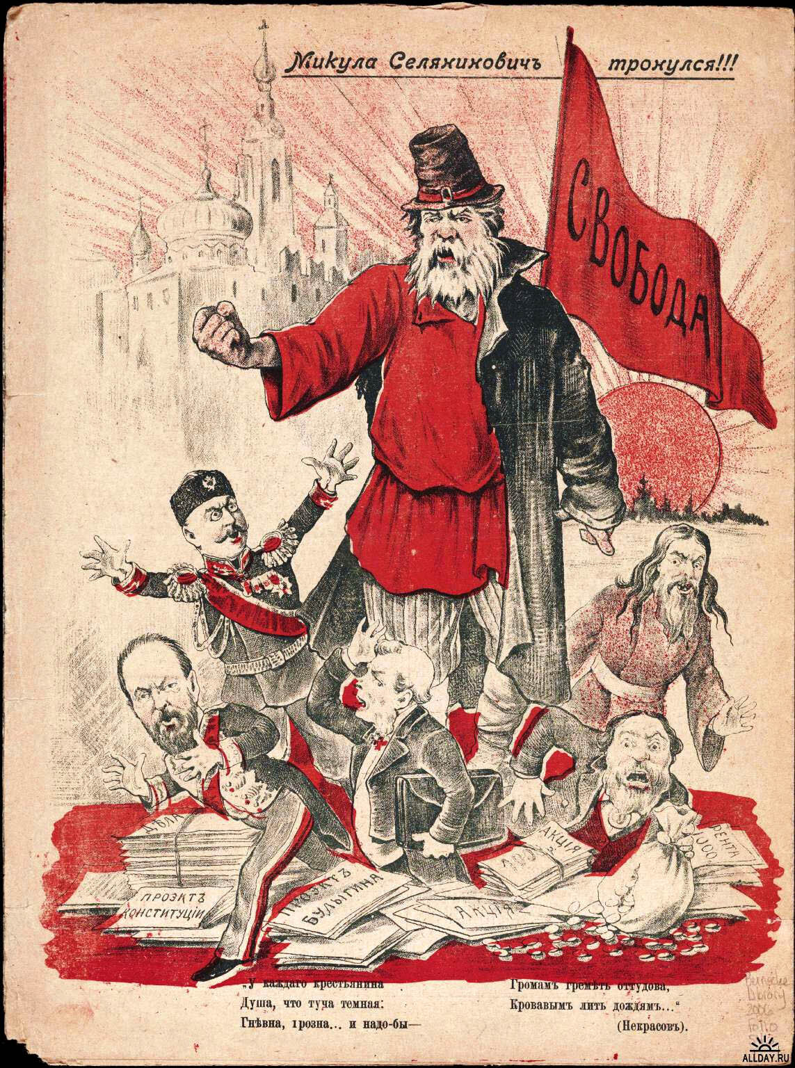 Микула Селянинович тронулся (карикатура из журнала «Ворон» № 1, 1906)