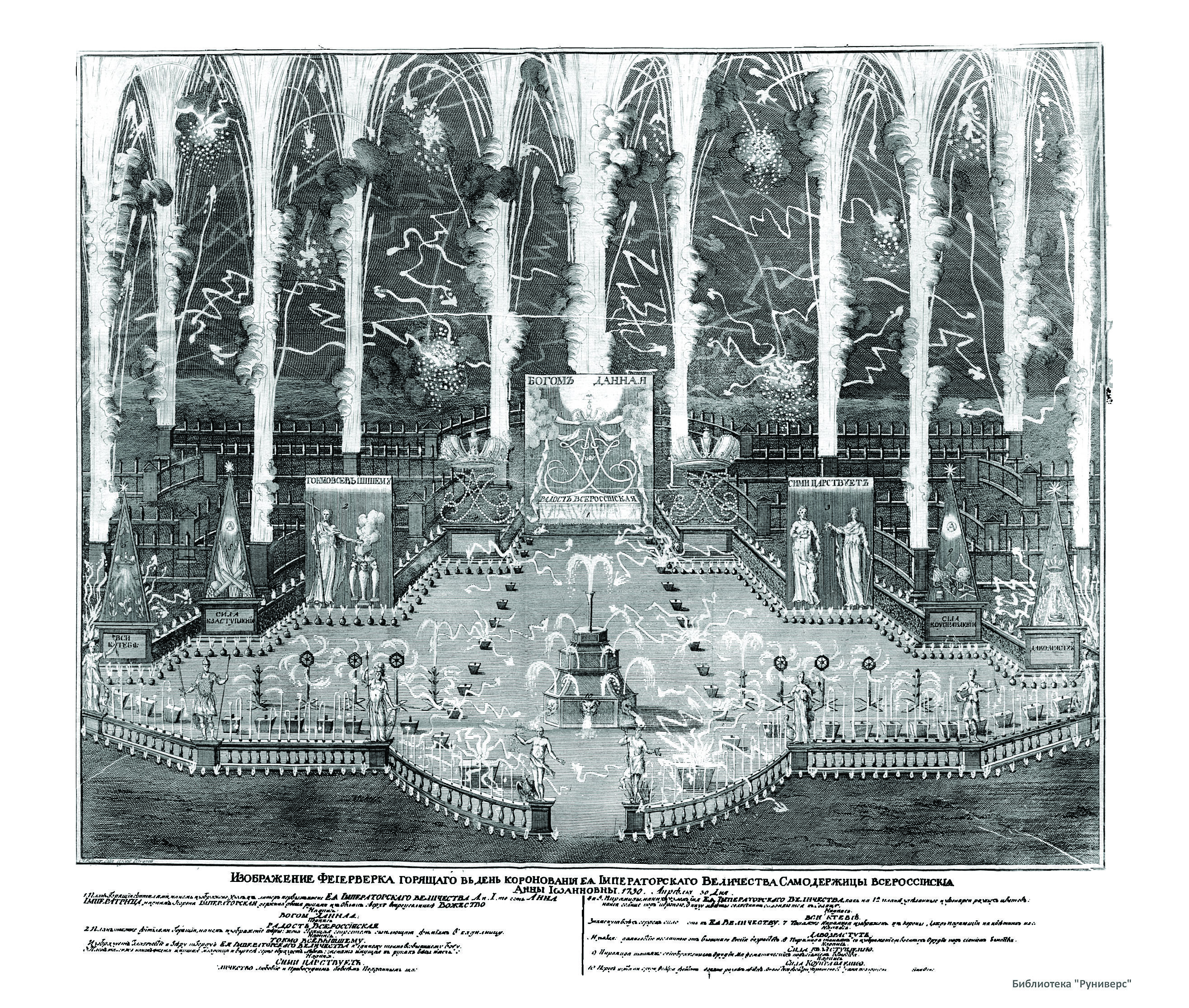 Изображение фейерверка, горящего в день коронования Ее Императорского Величества Самодержицы Всероссийской Анны Иоанновны. 1730, апреля 30 дня.