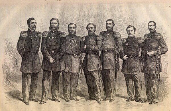 Литография неизвестного автора по фотографии “Admiral Lessofsky and his Captains”, сделанной Mathew Brady в его салоне в Нью-Йорке в 1863 году
