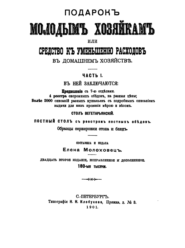 Выпускница Смольного института для благородных девиц, Елена Молоховец стремилась помочь молодым хозяйкам при небольшом состоянии и умеренном расходе иметь постоянно вкусный, здоровый и разнообразный обед.