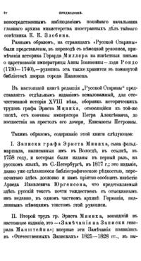 В сборник включены «Записки графа Эрнста Миниха» (1817), написанные им в Вологде в ссылке в 1758 году. Впервые на русском языке они были изданы в Санкт-Петербурге в 1817 году.