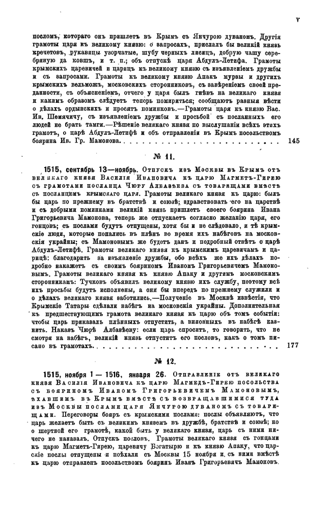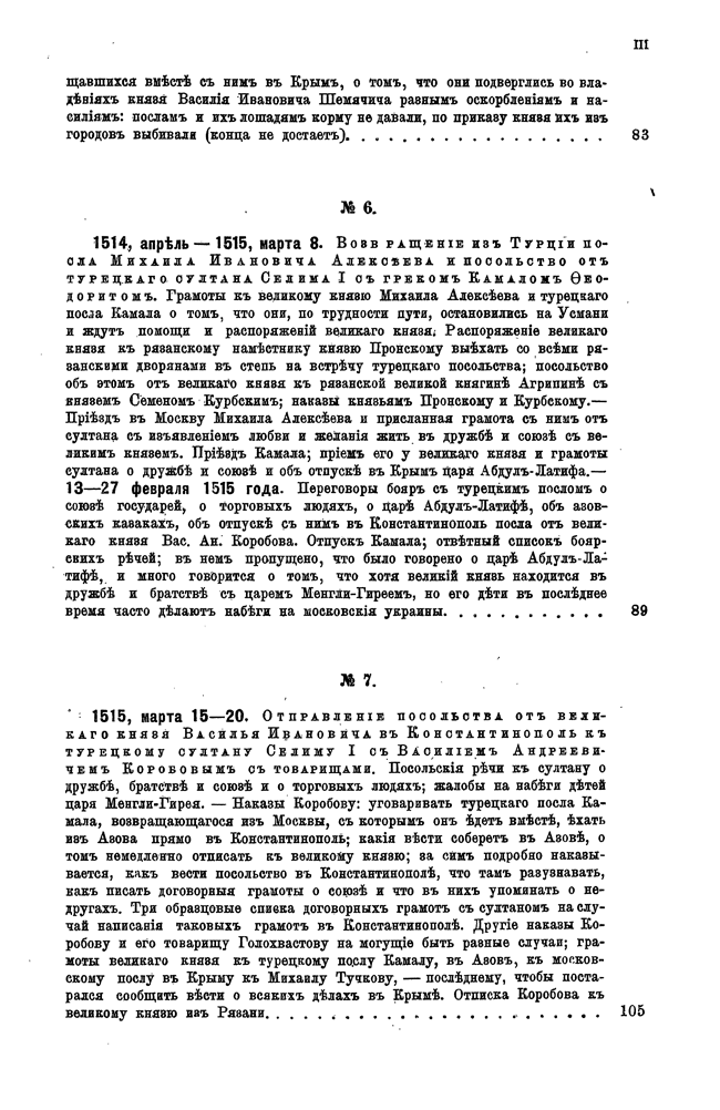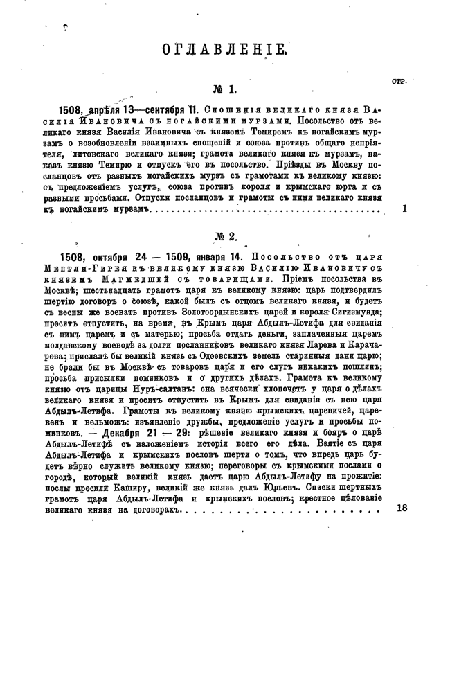 Настоящий том является продолжение издания «Памятников дипломатических сношений Московского государства с державами иностранными» и заключает в себе дипломатические сношения древней России с Ногайской и Крымской ордами и с Турцией, за время правления великого князя Василия III. Главная цель сношений с ордами со стороны великого князя состояла в том, чтобы добиться заключения союза против Литовского великого князя, а со стороны крымского царя — чтобы добиться освобождения из Московского плена Крымского царевича Абдыл-Летифа и получит помощь против Астраханского царства. Сношения же с Турцией ограничивались в основном торговыми целями. Материалом для этого тома послужили статейные списки, хранящиеся в Московском архиве министерства иностранных дел.