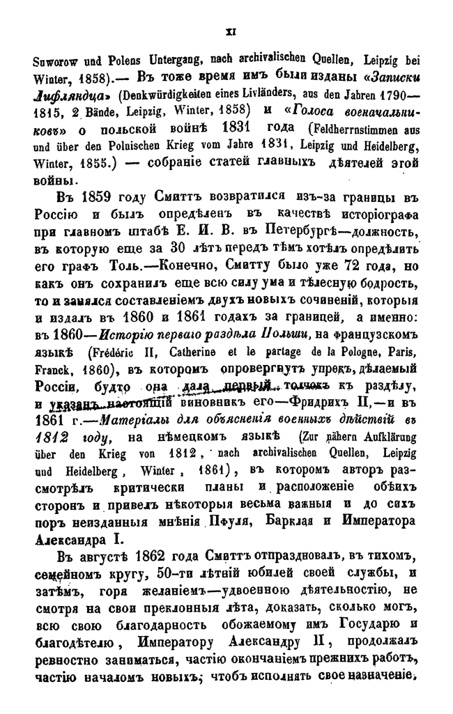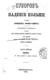 Эта книга долгое время считалась наиболее ценнной биографией великого русского полководца. Несмотря на название, основное внимание уделено имено жизни самого Суворова, Для себя Смитт выдвинул следующие цели: 1) изобразить правдиво падение Польской республики и, в тоже время, жизнь и подвиги Суворова 2) опровергнуть ложное мнение о Суворове, существовавшее в Западной Европе и, особенно, Германии 3) показать актами и документами истинное величие такого человека, как Суворов. Со всеми этими задачами автор вполне справился.
