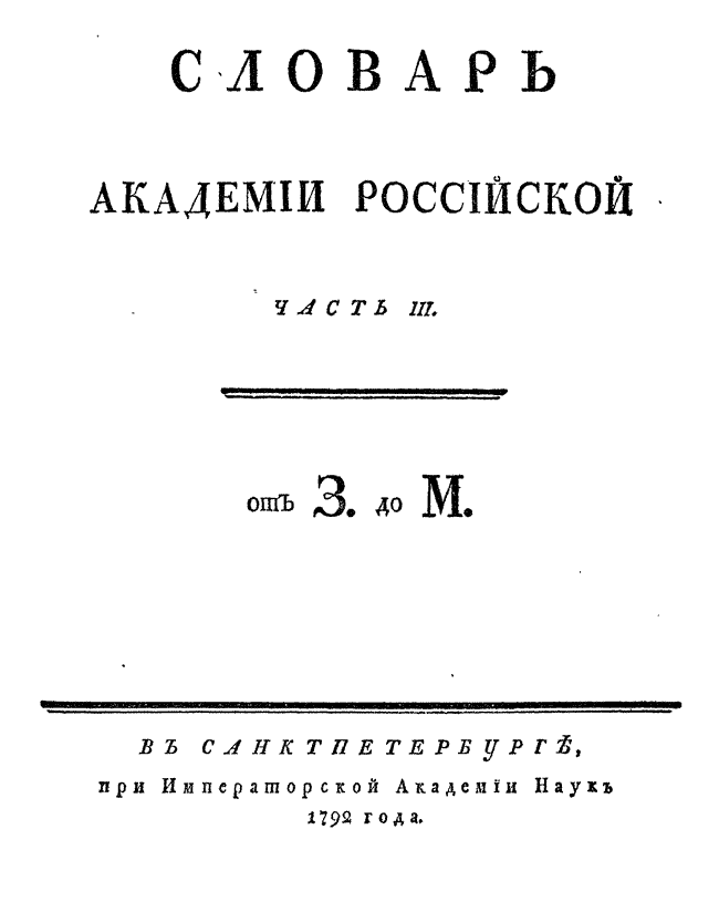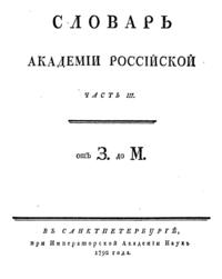 Знаменитый словарь Российской Академии, первый толковый словарь русского языка, содержащий 43 357 слов в 6 частях. Работа над словарём началась в 1783 году, и заняла 11 лет.