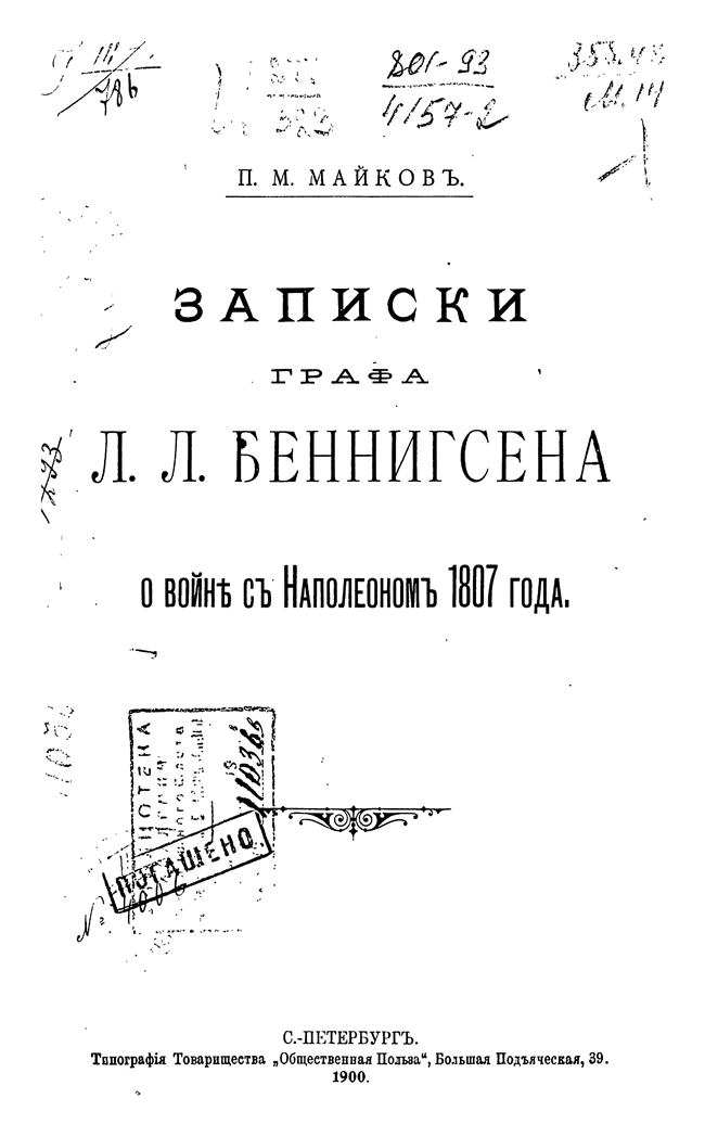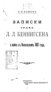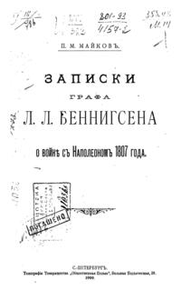 Майков подготовил к публикиции записки генерала Беннигсена, посвященные войне 1807 года. Неоднозначно воспринимаемая у нас фигура, получившая славу «закулисного интригана» в период Отечественной войны, в кампании