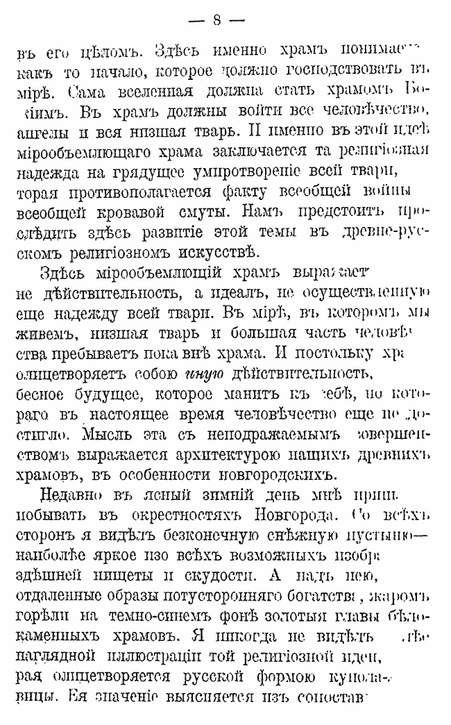 Книга посвящена русской религиозной живописи и символике православного храма. Она написана во время Первой мировой войны, когда обнажаются мировое зло и бессмыслица, а «целые народы все свои помыслы сосредотачивают на одной цели – создании большой челюсти для сокрушения и пожирания других народов». В это время особенно остро звучит вопрос, который всегда был основным для человека, вопрос о смысле жизни. Прямой ответ на него представляет древнерусская живопись. Её символический язык передаёт высшее веление, обращённое к сознанию и воле человека, и несёт достоверное знание о том, что над царством зверя есть иной закон жизни, который восторжествует.