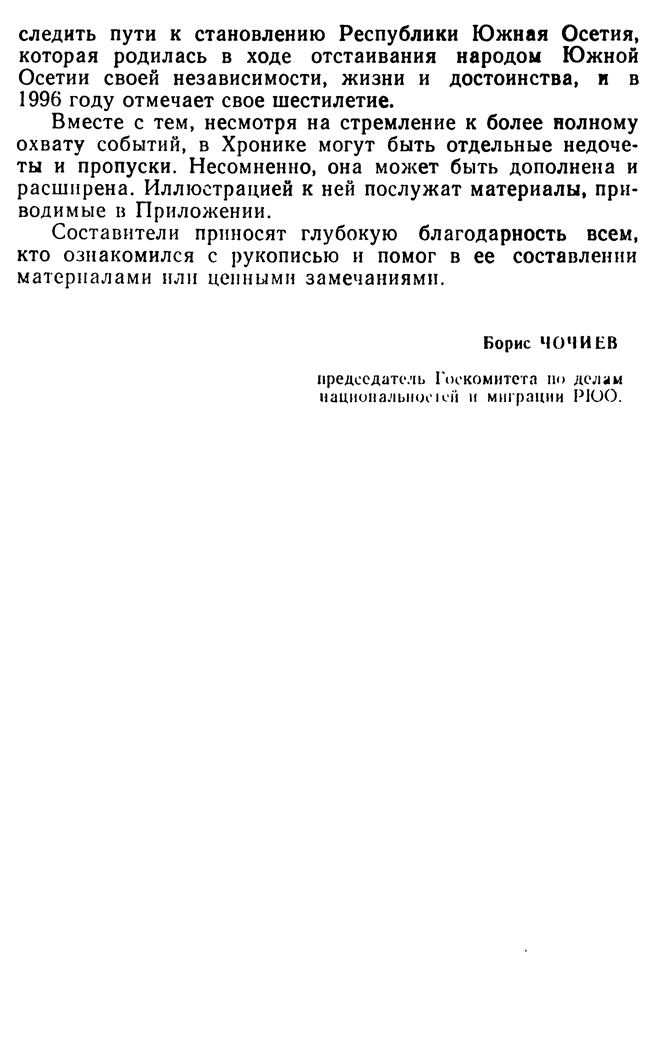 Целью «Хроники событий Грузинской агрессии» является восстановление хронологии развития политических процессов и событий, происшедших в Южной Осетии и вокруг нее в 1988-1992 годы. В ней отражены основные факты, важнейшие решения, даты наиболее тяжелых событий. Последовательный обзор этих событий поможет проследить пути к становлению Республики Южная Осетия, которая родилась в ходе отстаивания народом Южной Осетии своей независимости, жизни и достоинства.