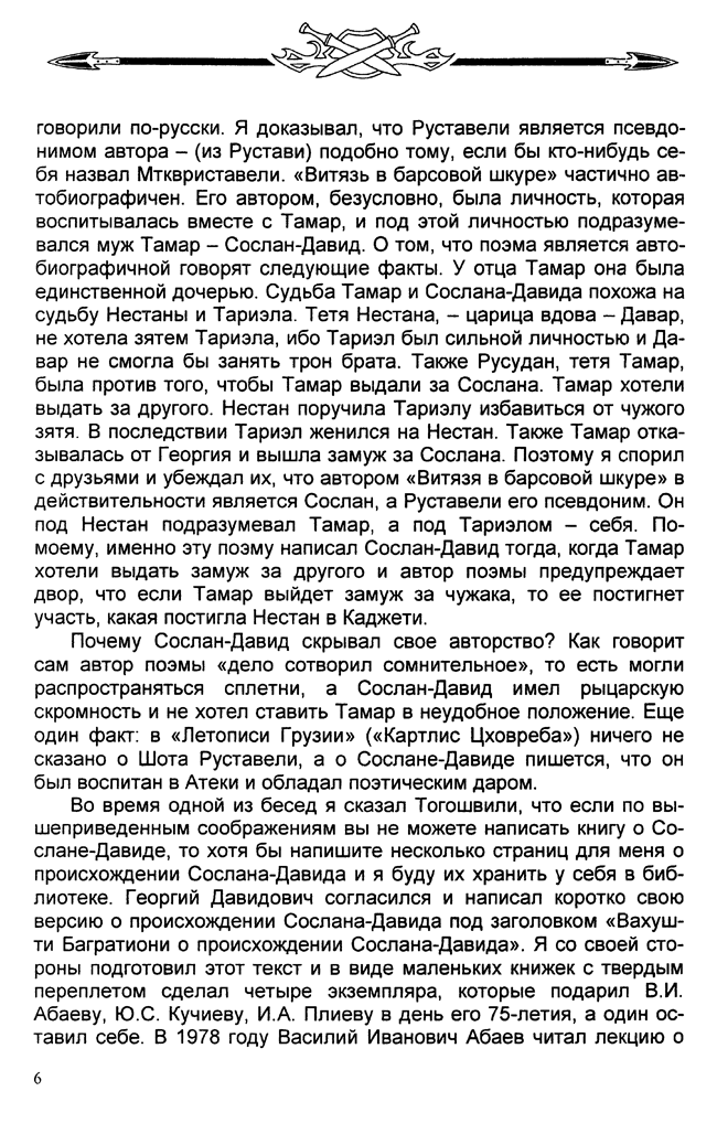В данной работе содержатся материалы, ранее опубликованные в печати Северной и Южной Осетии, раскрывающие завесу таинственности над именем легендарного осетинского государственного деятеля и военачальника Сослана-Давида Царазона. В сборнике представлены работы доктора исторических наук, профессора Г.Д. Тогошвили, доктора исторических наук, профессора В.Д. Дзидзоева и кандидата философских наук К.Г. Дзугаева. В начале брошюры дается материал составителя данного издания А.Г. Маргиева, рассказывающего о своих встречах с Г.Д. Тогошвили.