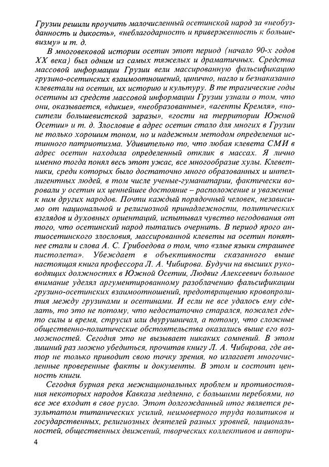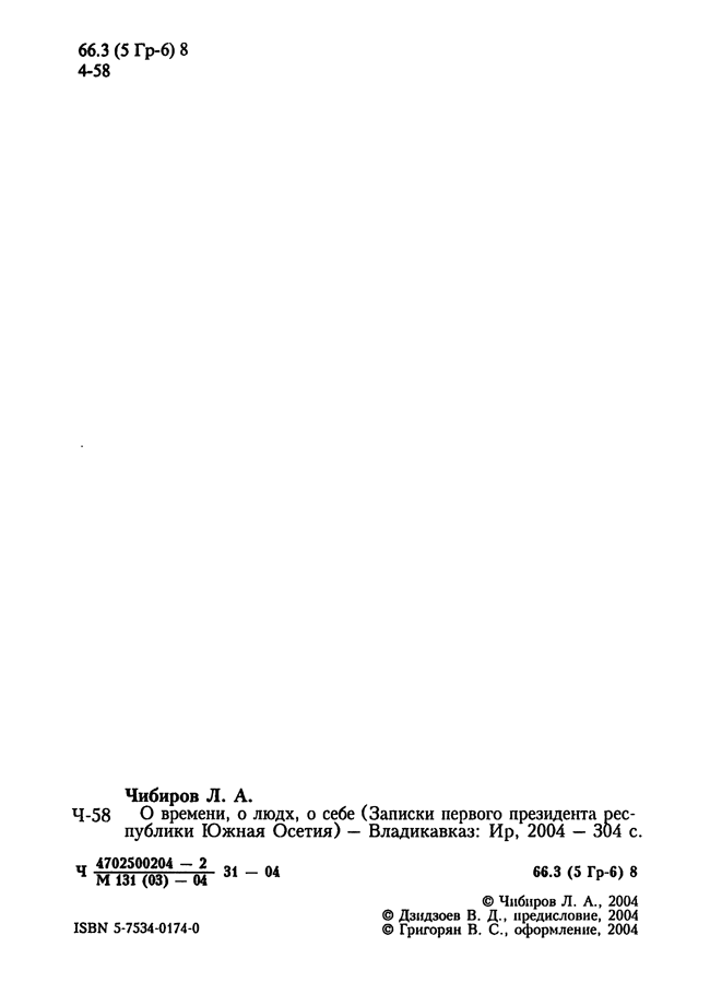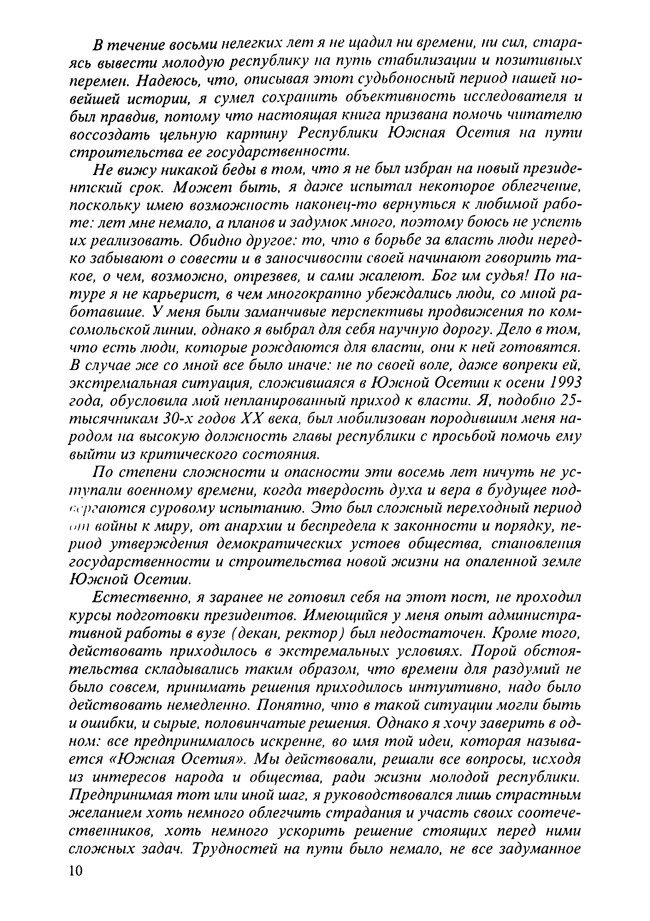 Автором настоящей книги является очевидец и активный участник событий, который в течение восьми труднейших лет (1993-2001) руководил Республикой Южная Осетия сперва в качестве Председателя Верховного Совета, а затем Президента республики. Анализ общественно-политической обстановки, межнациональных отношений в Южной Осетии и Грузии чередуются с интересными экскурсами в историю, философию и юриспруденцию. Они, в свою очередь, сменяются авторскими размышлениями о происходивших событиях в Южной Осетии, Грузии, Российской Федерации, их причинах и следствиях, перспективах решения сложившихся проблем, накопившихся за многие годы.