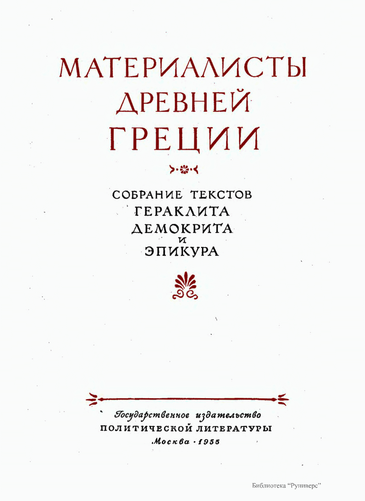 В настоящее издание текстов древнегреческих материалистов включены фрагменты Гераклита Эфесского в переводе М. А. Дынника; фрагменты Демокрита и свидетельства о нем в переводе