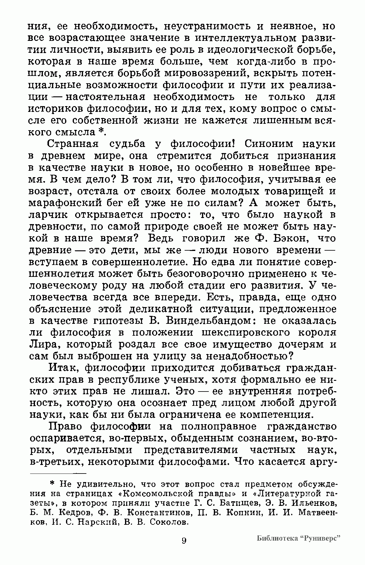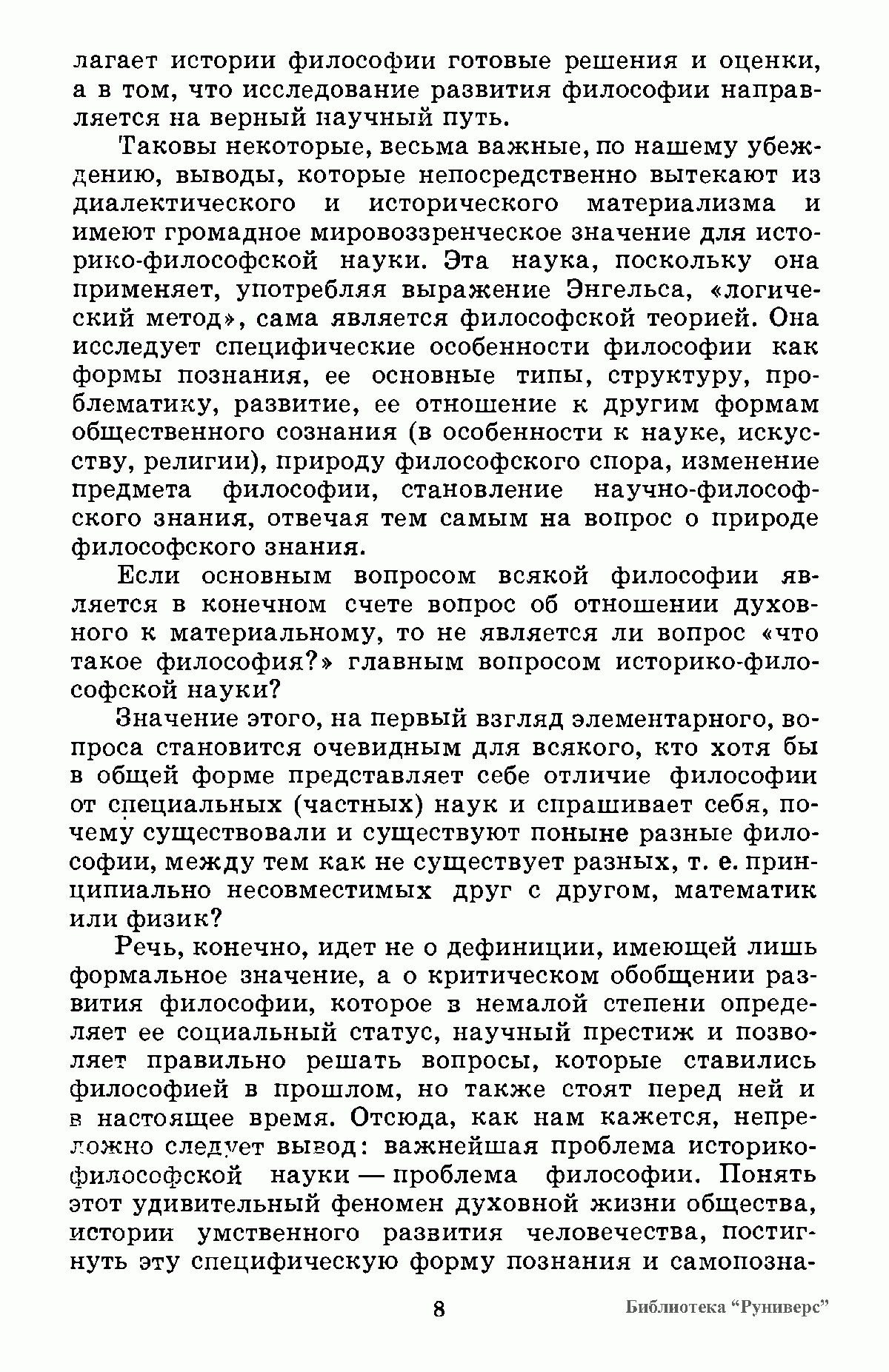 На основе сравнительного анализа философских учений прошлого и настоящего автор исследует специфику философской формы познания, структуру философского знания, исторически преходящий характер дивергенции философских учений, изменение места философии в системе научных знаний, развитие предмета философии, превращение философии в научное мировоззрение, взаимоотношение философии и частных наук, природу философского спора, идеологические функции философии.