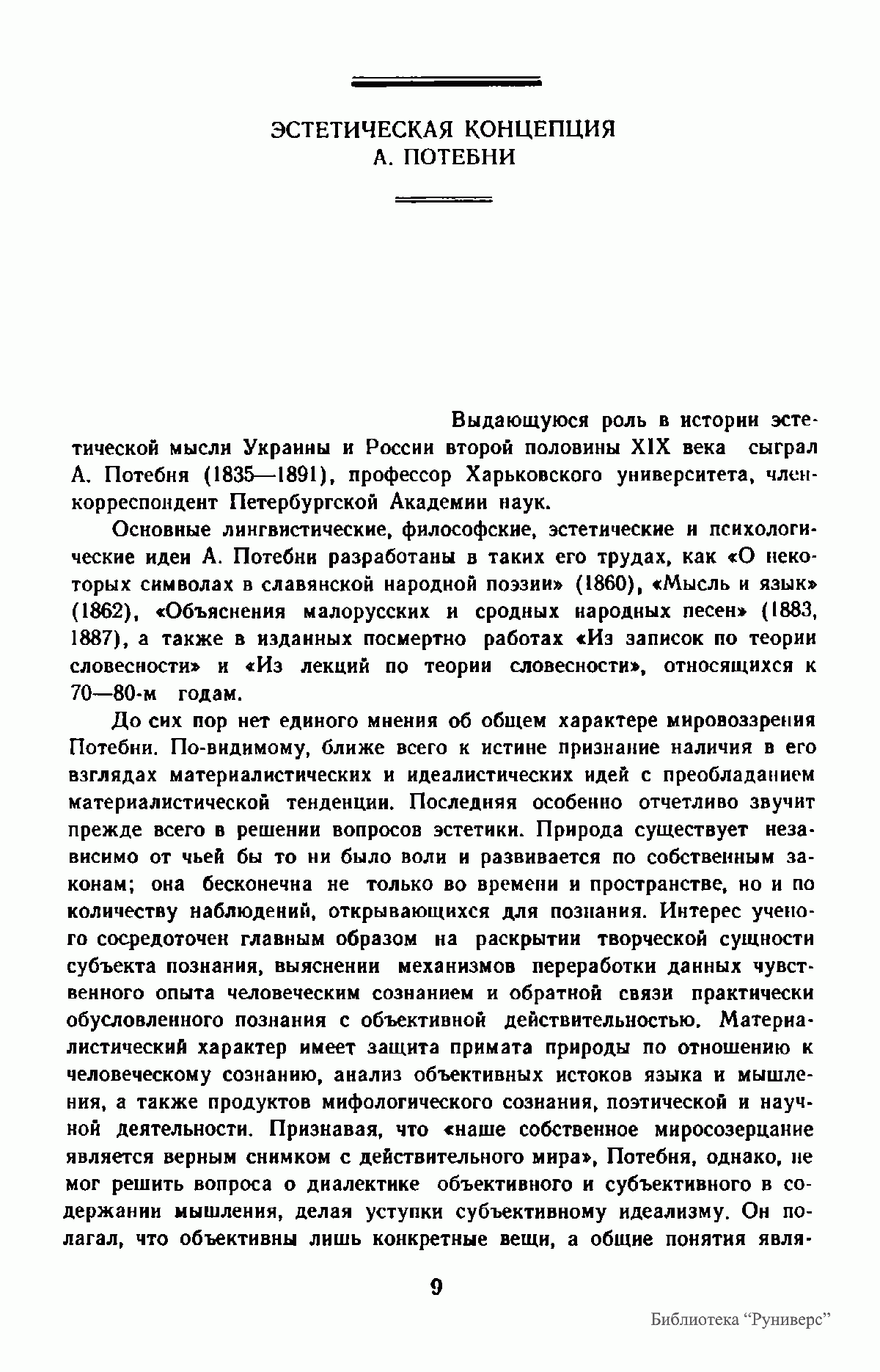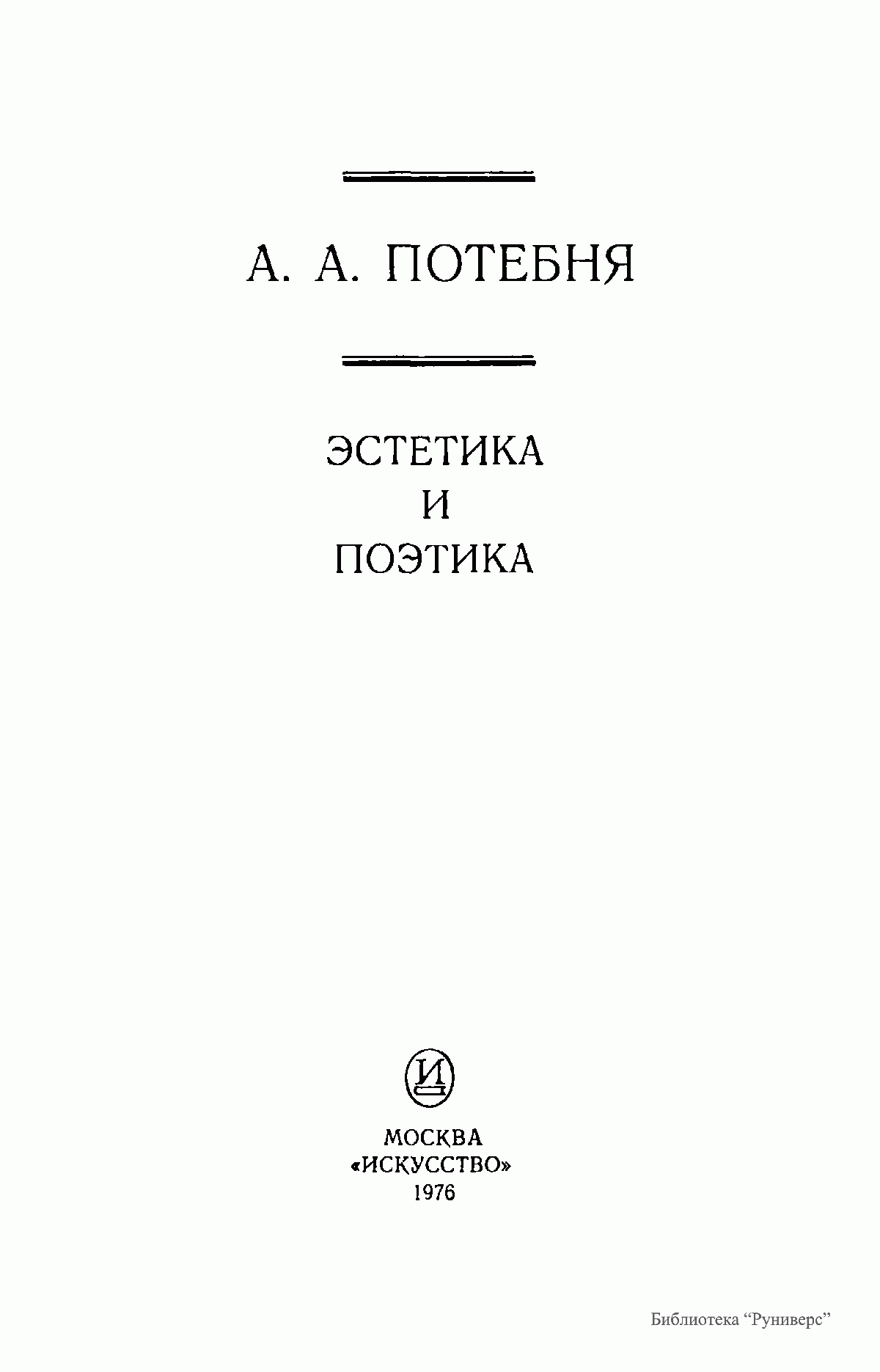 В книге впервые собраны работы выдающегося мыслителя XIX века А. А. Потебни (1835-1891), эстетические идеи которого оказали большое влияние на развитие теории и психологии художественного творчества. Существенные проблемы искусства рассматриваются Потебней в таких трудах, как «Мысль и язык», «Из записок по теории словесности», в статьях и высказываниях о народном творчестве и произведениях художников слова.