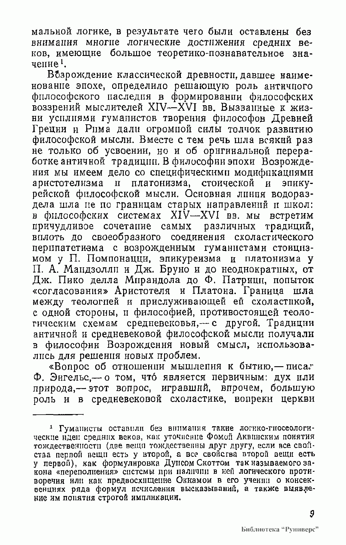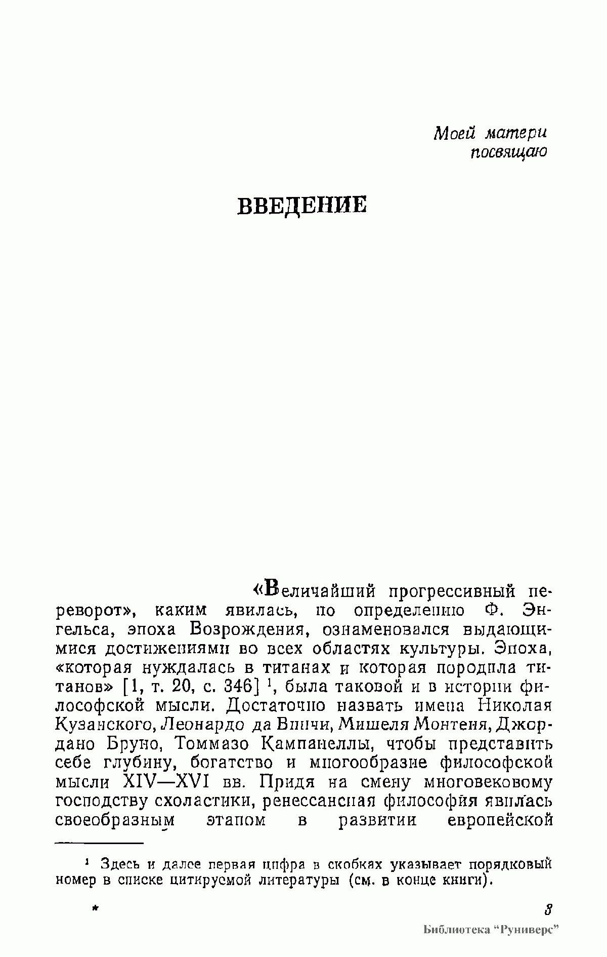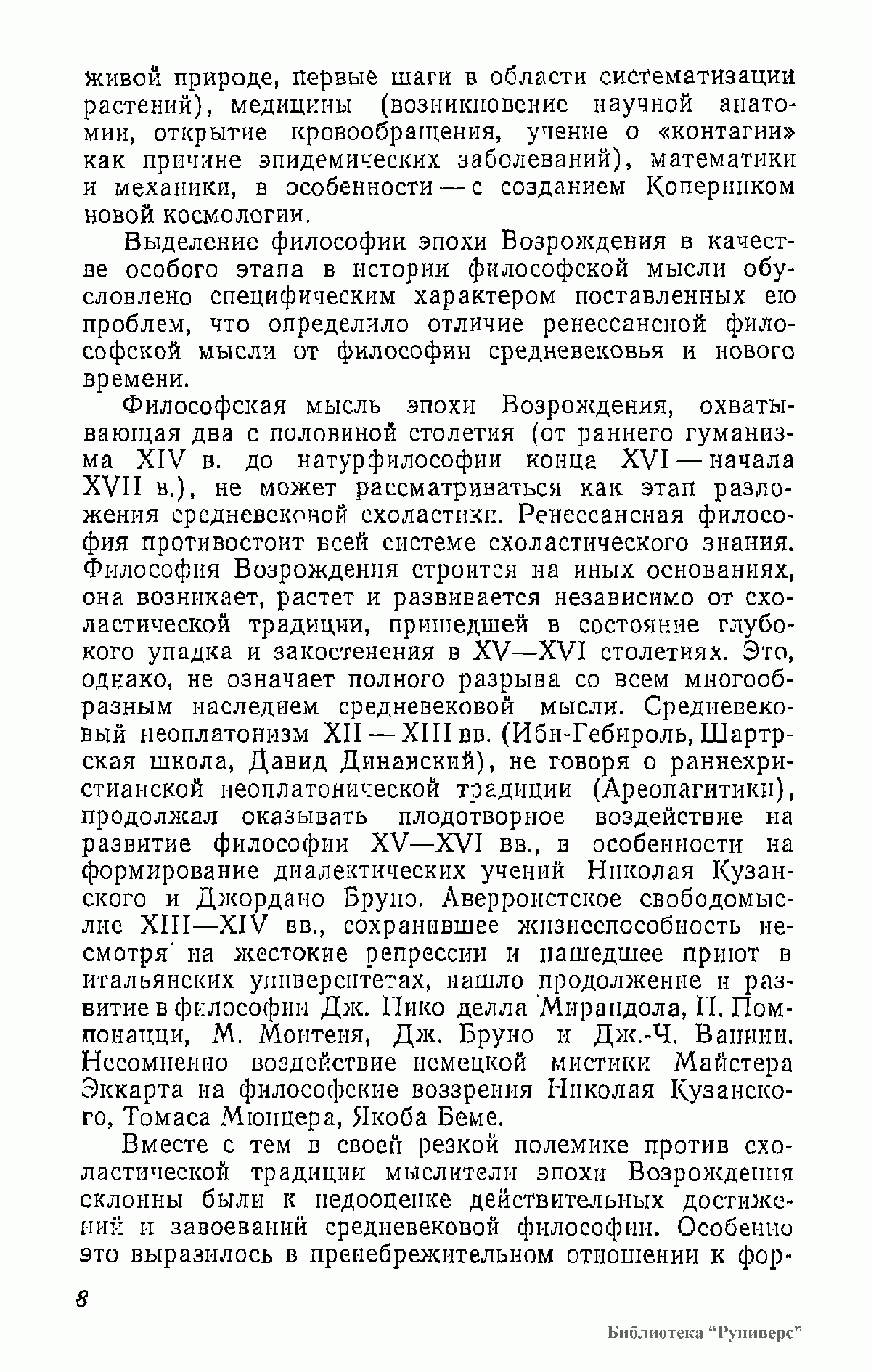 В книге анализируются философские и социологические взгляды Данте, Ф. Петрарки, Николая из Кузы, Леонардо да Винчи, Н. Коперника, М. Монтеня, Дж. Бруно, Т. Кампанеллы, Г. Галилея и др. Работа основана на многочисленных источниках, прежде всего на подлинных текстах философов XIV—XVI вв., по большей части не переводившихся на русский язык; она содержит аргументированную критику буржуазно-идеалистических и клерикальных истолкований философского наследия эпохи Возрождения.