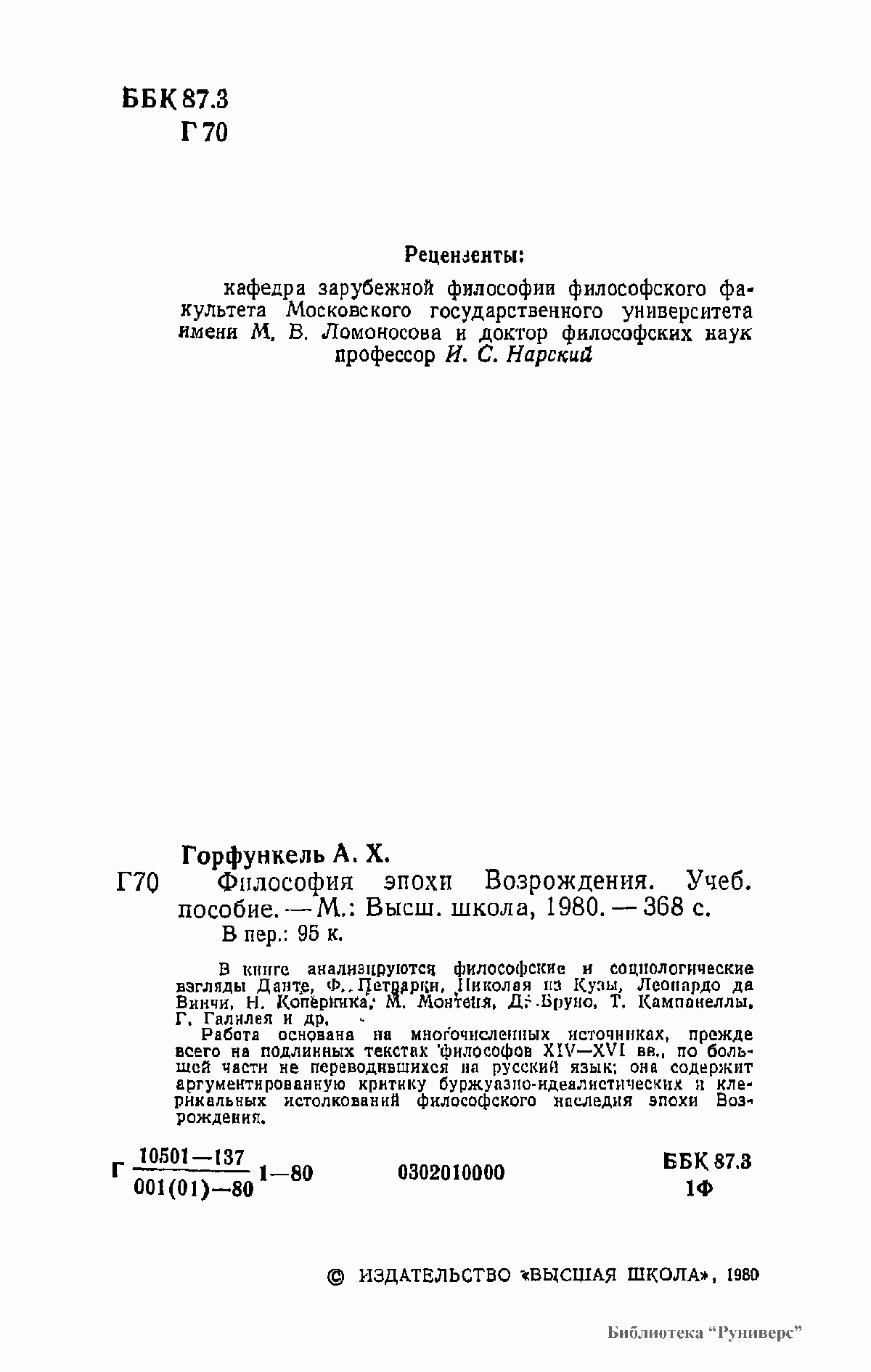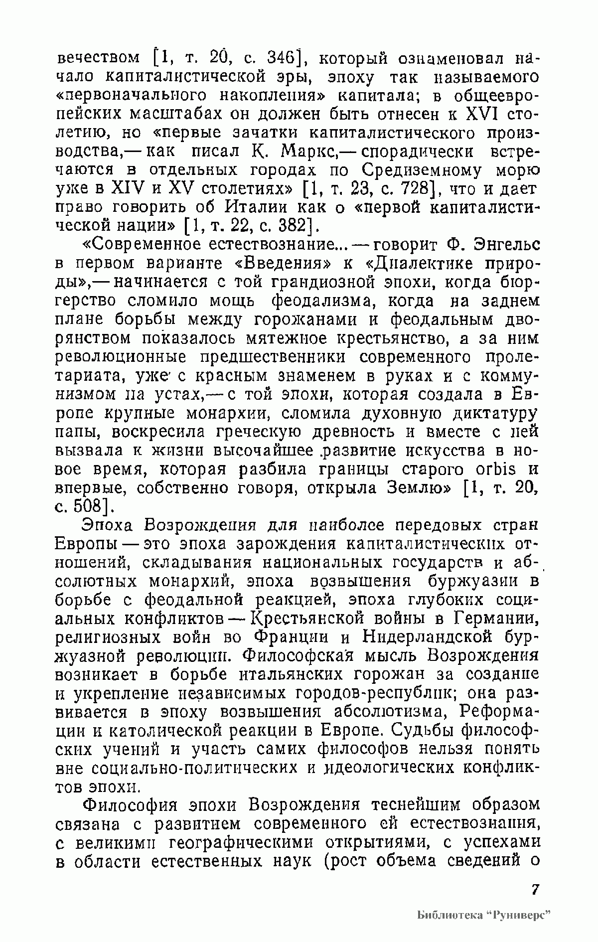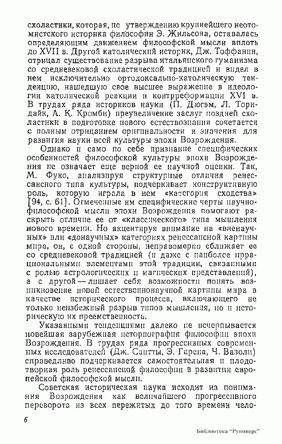 В книге анализируются философские и социологические взгляды Данте, Ф. Петрарки, Николая из Кузы, Леонардо да Винчи, Н. Коперника, М. Монтеня, Дж. Бруно, Т. Кампанеллы, Г. Галилея и др. Работа основана на многочисленных источниках, прежде всего на подлинных текстах философов XIV—XVI вв., по большей части не переводившихся на русский язык; она содержит аргументированную критику буржуазно-идеалистических и клерикальных истолкований философского наследия эпохи Возрождения.