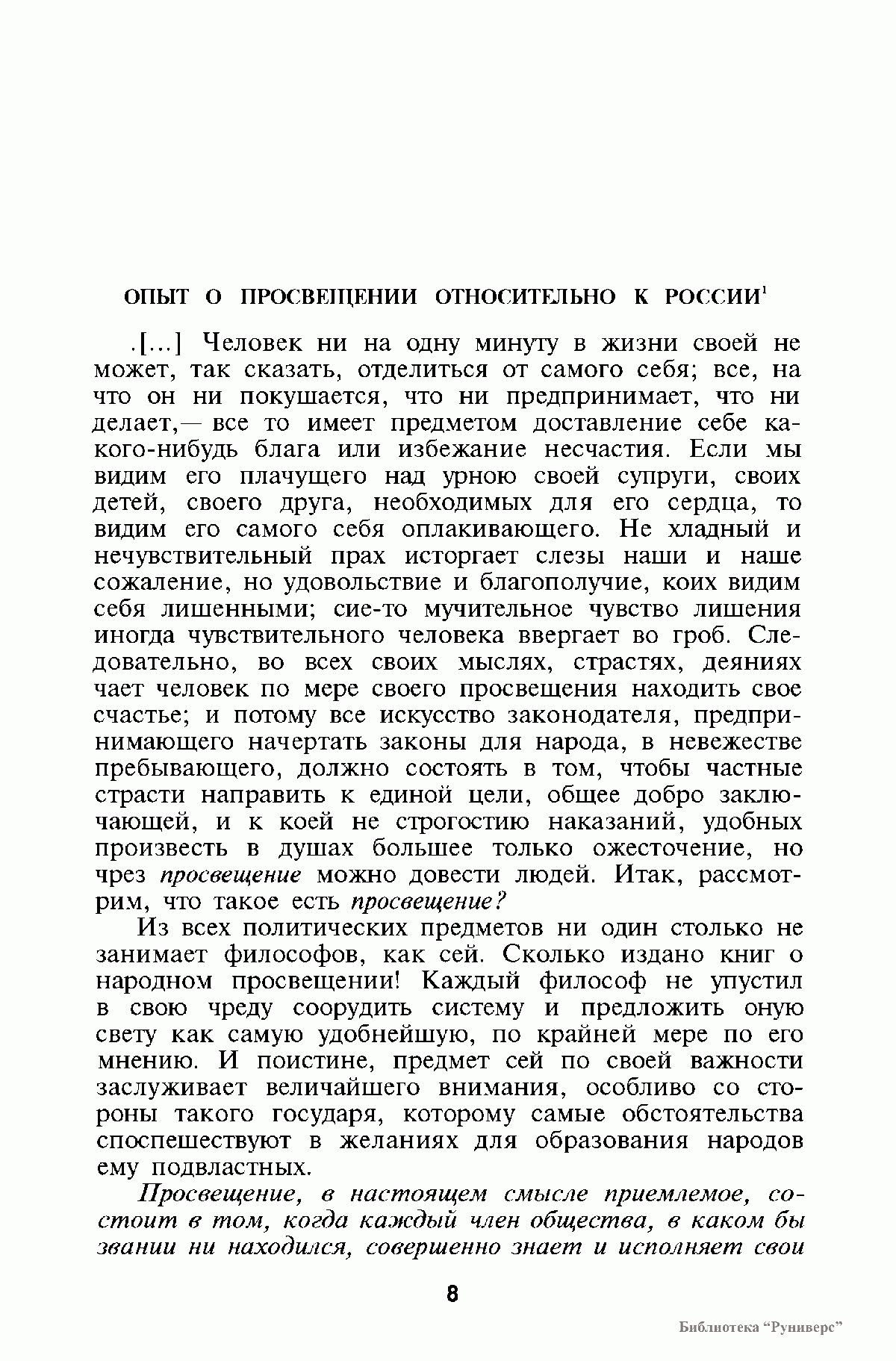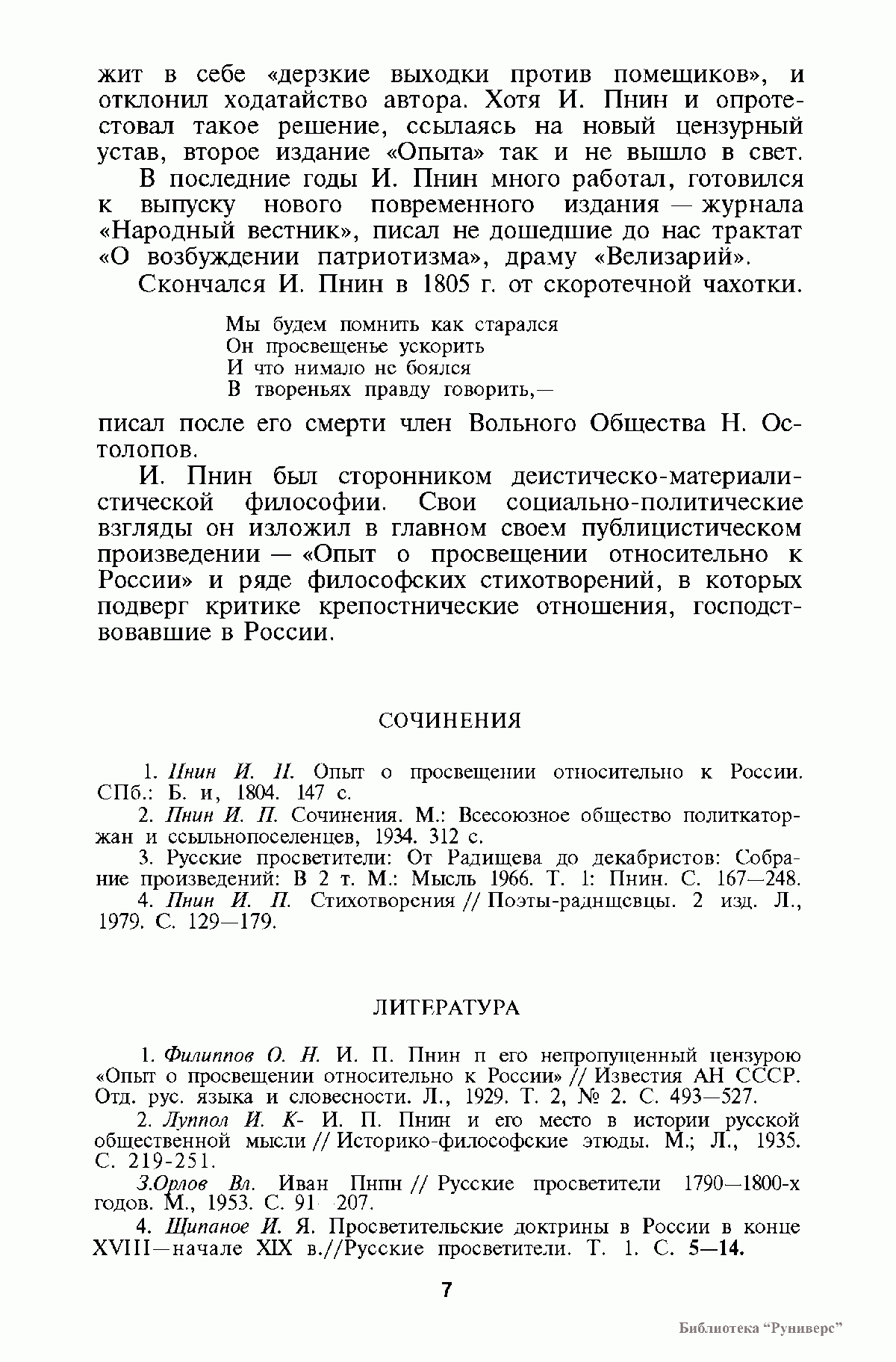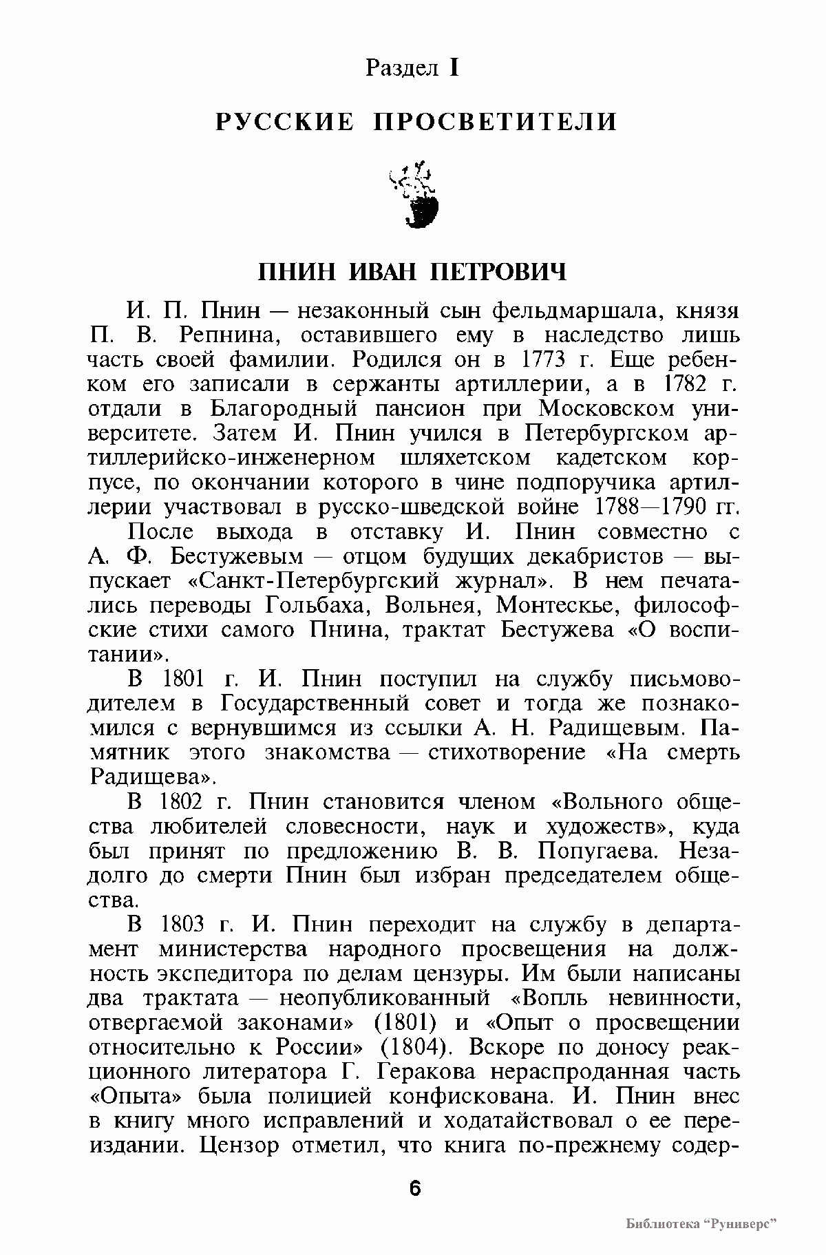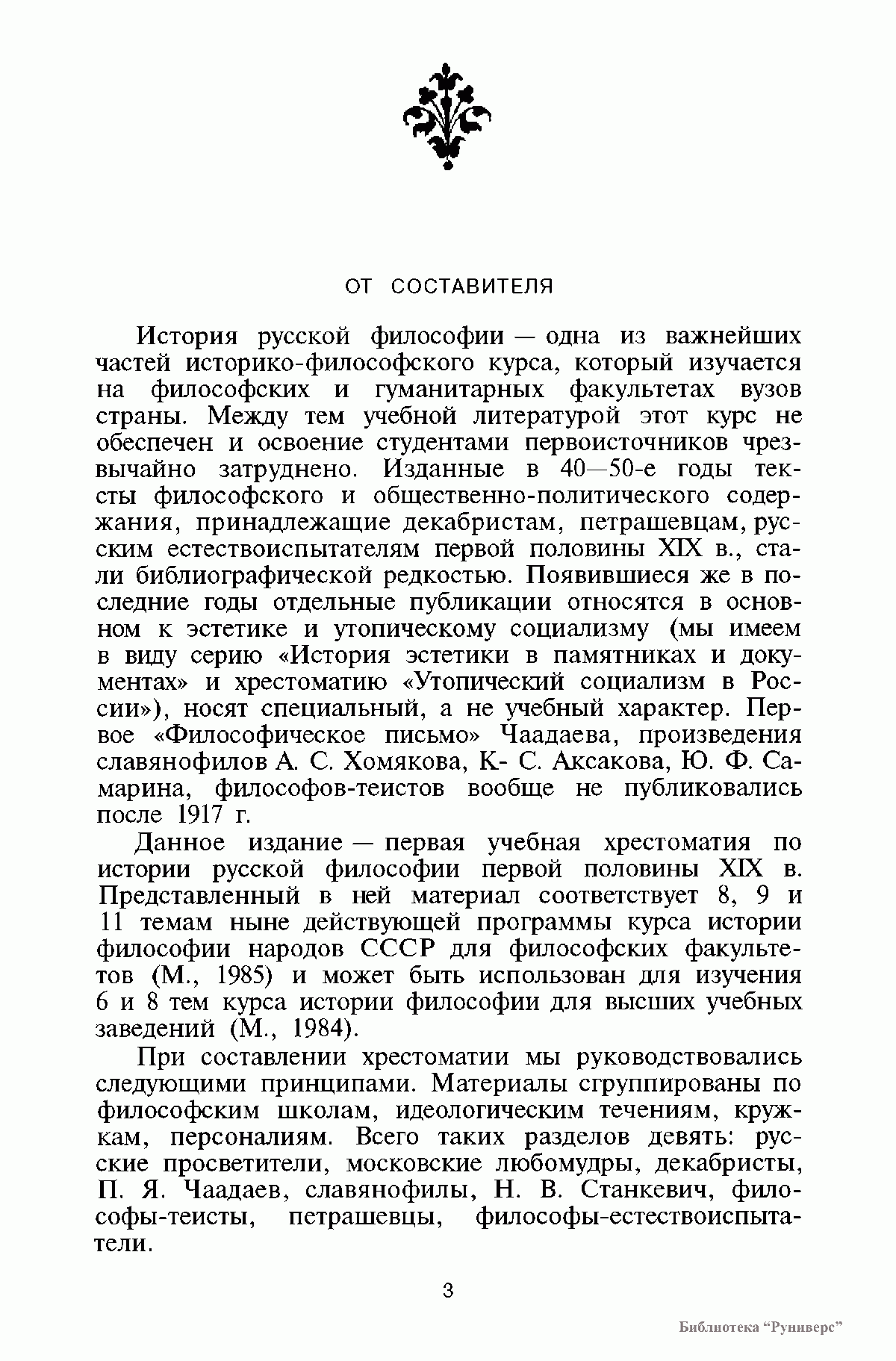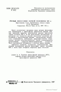 Книга соответствует программе курса истории философии для гуманитарных и философских факультетов высших учебных заведений, включает произведения русских мыслителей первой половины XIX в. В ней представлены произведения, характерные для творчества русских мыслителен различных философских и идеологических течений — просветителей, декабристов, славянофилов, любомудров, философов-теистов, петрашевцев, русских естествоиспытателей. Тексты сопровождаются примечаниями, справочно-библиографическим аппаратом.