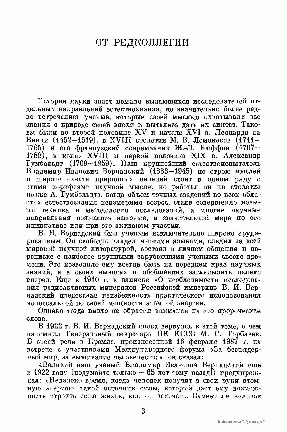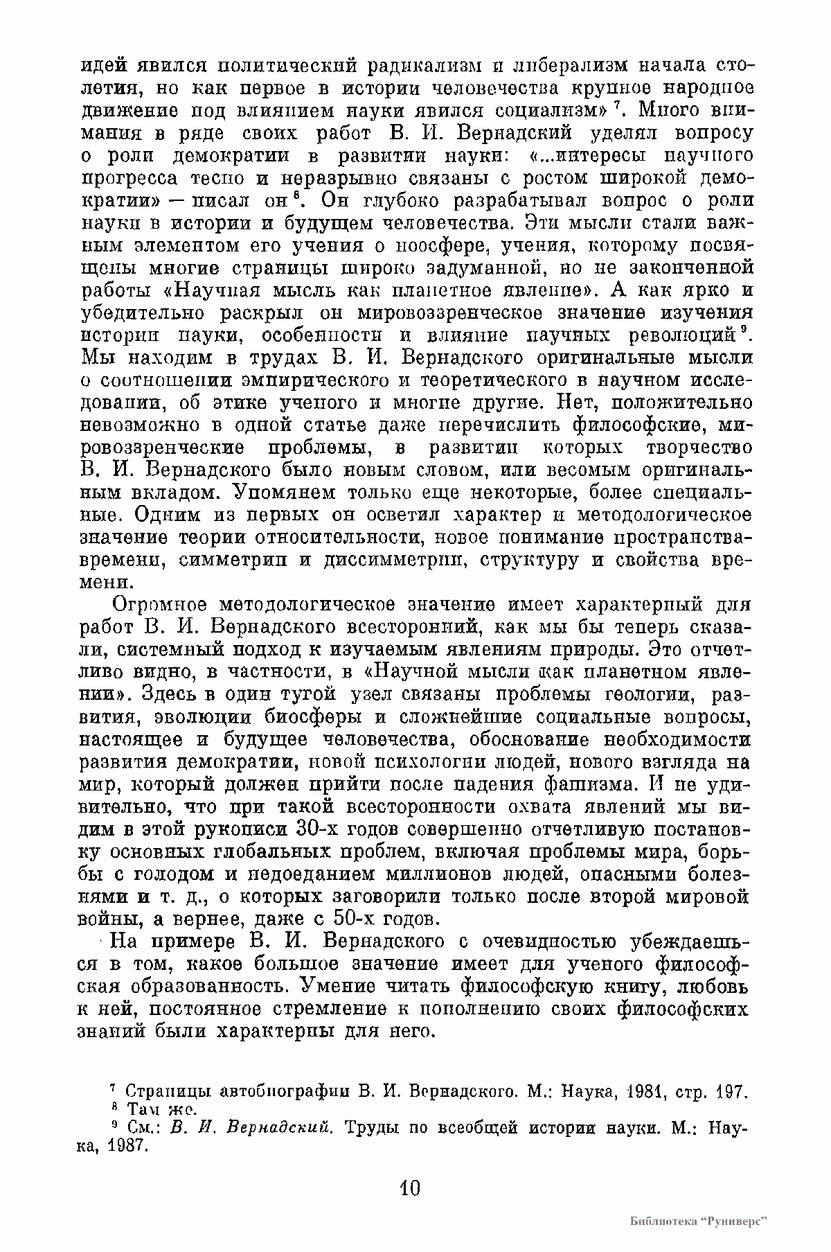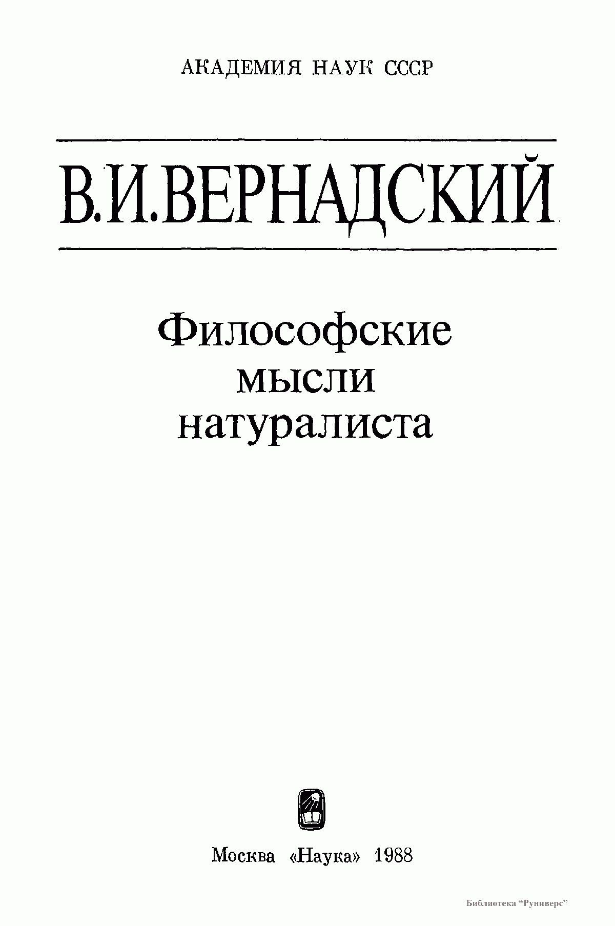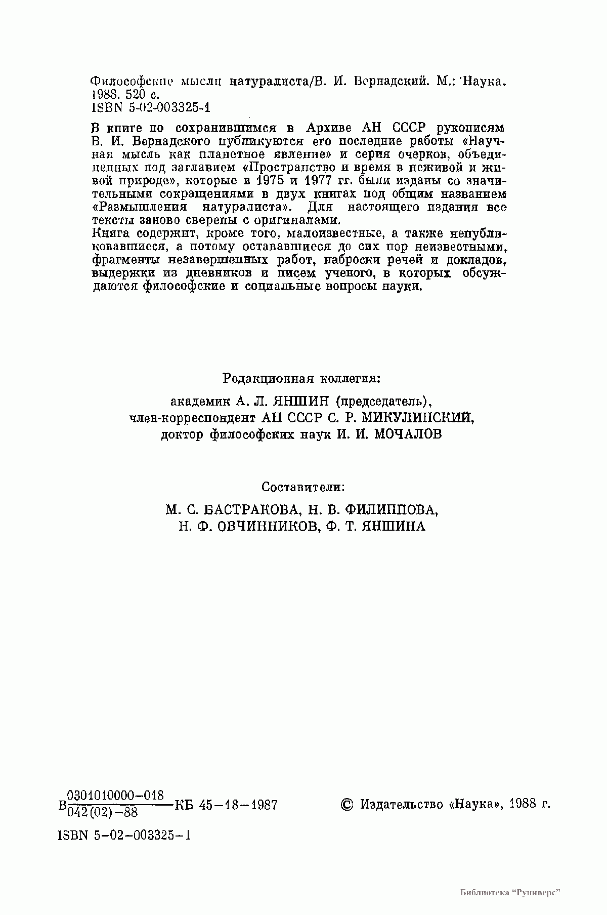 В книге по сохранившимся в Архиве АН СССР рукописям В. И. Вернадского публикуются его последние работы «Научная мысль как планетное явление» и серия очерков, объединенных под заглавием «Пространство и время в неживой и живой природе», которые в 1975 и 1977 гг. были изданы со значительными сокращениями в двух книгах под общим названием «Размышления натуралиста». Для настоящего издания все тексты заново сверены с оригиналами. Книга содержит, кроме того, малоизвестные, а также непубликовавшиеся, а потому остававшиеся до сих пор неизвестными, фрагменты незавершенных работ, наброски речей и докладов, выдержки из дневников и писем ученого, в которых обсуждаются философские и социальные вопросы науки.