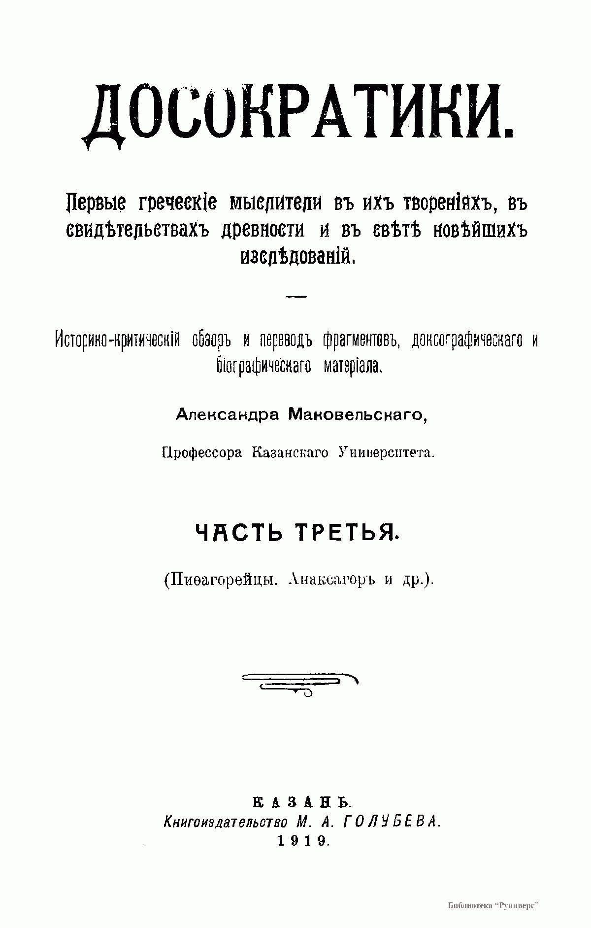 Досократики. Часть третья (Пиѳагорейцы, Анаксагоръ и др.)