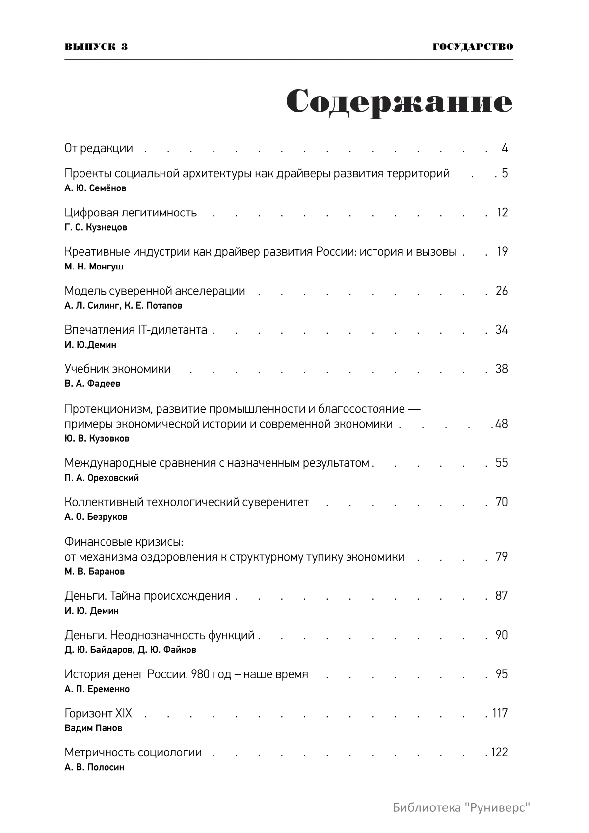Сборник охватывает три ключевых блока тем: 1. Кризис знаний, новая метрика общества и социальное проектирование. 2. Природа денег и критический пересмотр экономической истории. 3. Технологический суверенитет и конкуренция управленческих моделей.