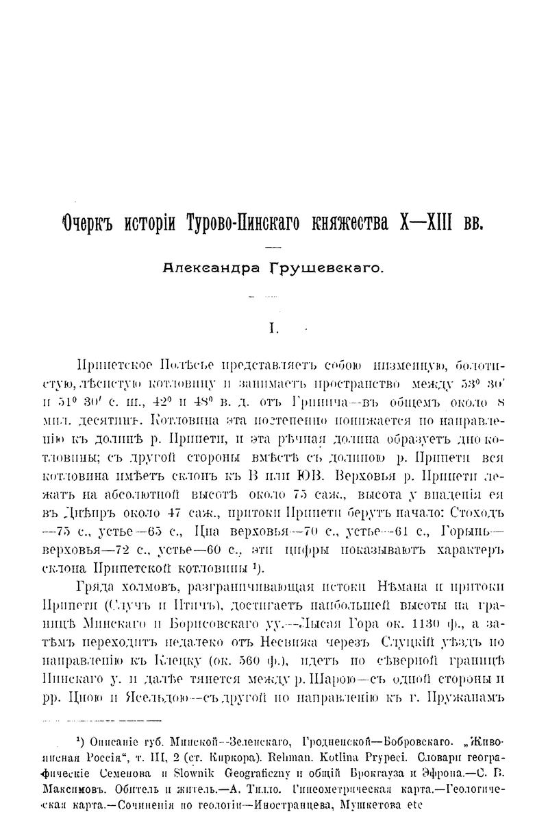 На историко-филологическом факультете Киевского университета св. Владимира в конце XIX в. велась серьёзная научная работа по изучению истории Древней Руси. Результатом этой работы явилась серия областных монографий. В эту серию входит и предлагаемое исследование Александра Грушевского. Его первая часть знакомит с историей Турово-Пинского княжества XI – XIII, находившегося в бассейне реки Припять.