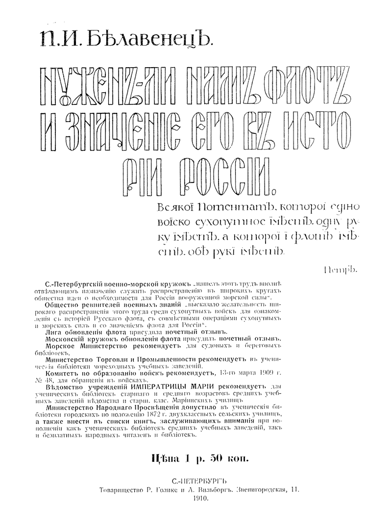 Данное издание является первым прижизненным издание автора, который полностью описывает историю развития Российского флота и кораблестроения, в сочетании с кратким изложением истории флота вообще.