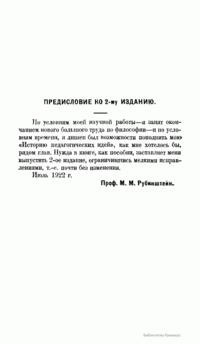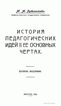 Книга "философа образования" М.М.Рубинштейна предназначена служить пособием к курсу истории педагогических идей, являясь своеобразным введением к непосредственному чтению классиков педагогики и систематической педагогики. В основу композиции этого учебного пособия положена "история идей", задача которой учить современников исходя из уже имеющегося в прошлом богатству философско-педагогических идей.