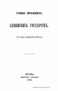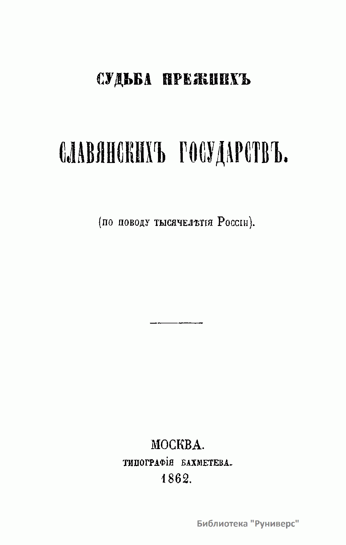 Популярная занимательная брошюра, посвященная предстоявшему в 1862 г. торжественному празднованию 1000-летия российской государственности (Тысячелетию России) принадлежит перу выдающегося отечественного славяноведа, прекрасного знатока истории, культуры, языка и верований славянских народов Александру Федоровичу Гильфердингу, автору значительных исследований в области общеславянской филологии. Автор, отмечая уникальность российской государственности, в весьма простой и доступной форме на примерах других славянских народов (государственных образований – мораван, чехов, поляков, словаков, хорватов, болгар и сербов), проводит сравнительный анализ причин распада славянских государств. Автор подробно останавливается на описании истории Чехии, оказавшейся, как и Польское государство, в орбите католической церкви и западноевропейской цивилизации в целом. Это «губительное», по мнению Гильфердинга, цивилизационное влияние настойчиво подавляло «стихию славянского начала», когда «Чешское государство стояло на высоте своего политического могущества». Именно этого удалось избежать российской национальной культуре, не подвергавшейся столь сильному влиянию западноевропейской (римско-католической, а затем протестантской) традиции, что и позволило восточнославянскому этносу сохранить свою самобытную государственность, достигнув тысячелетнего существования. Популярное исследование Гильфердинга весьма актуально в нынешних условиях преобразования современной России, отмечающей 1150-летие создания своей государственности.