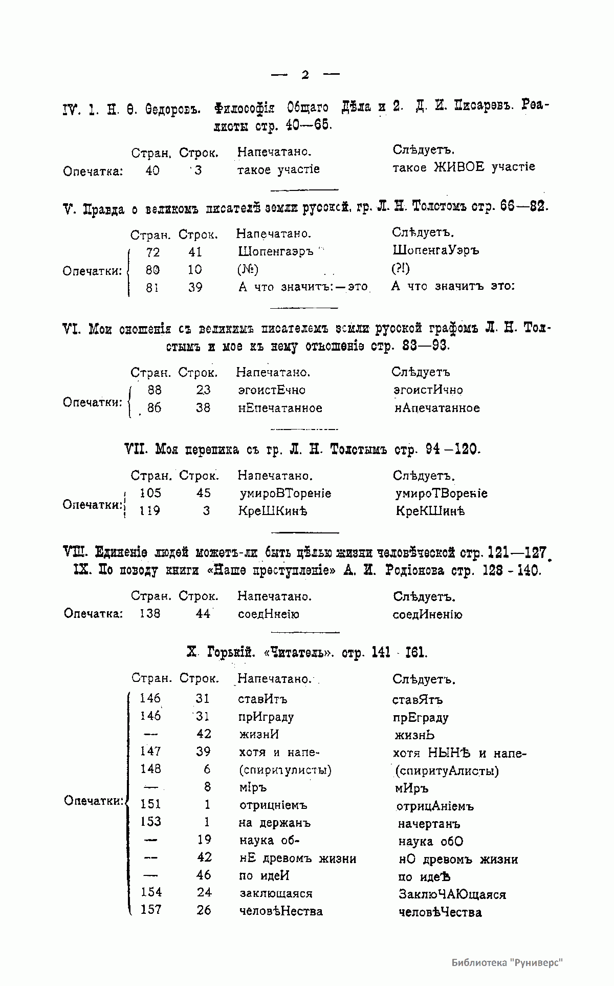пишет В. И. Алексееву: «Это библиотекарь Румянцевской библиотеки. Помните, я Вам рассказывал. Он составил план общего дела всего человечества, имеющего целью воскрешение всех людей во плоти. Во-первых, это не так безумно, как кажется. (Не бойтесь, я не разделял никогда его взглядов, но я так понял их, что чувствую себя в силах защитить эти взгляды перед всяким другим верованием, имеющим внешнюю цель. Во-вторых и главное, благодаря этому верованию он по жизни самый чистый христианин.) Когда я ему говорю об исполнении Христова учения, он говорит: да это разумеется, и я знаю, что он исполняет его. - Ему 60 лет, он нищий и все отдает, всегда весел и кроток». Федоров, в свою очередь, наблюдал за творчеством своего, как он полагал, оппонента («Толстой и братское единение»; ««Неделание» ли или же отеческое и братское дело?»; «О русской литературе и о Толстом»; «Философские заметки о Толстом»; «Резюме философии Толстого»; «К статьям о Толстом»; «Панегиристу смерти, величайшему лицемеру нашего времени»).
