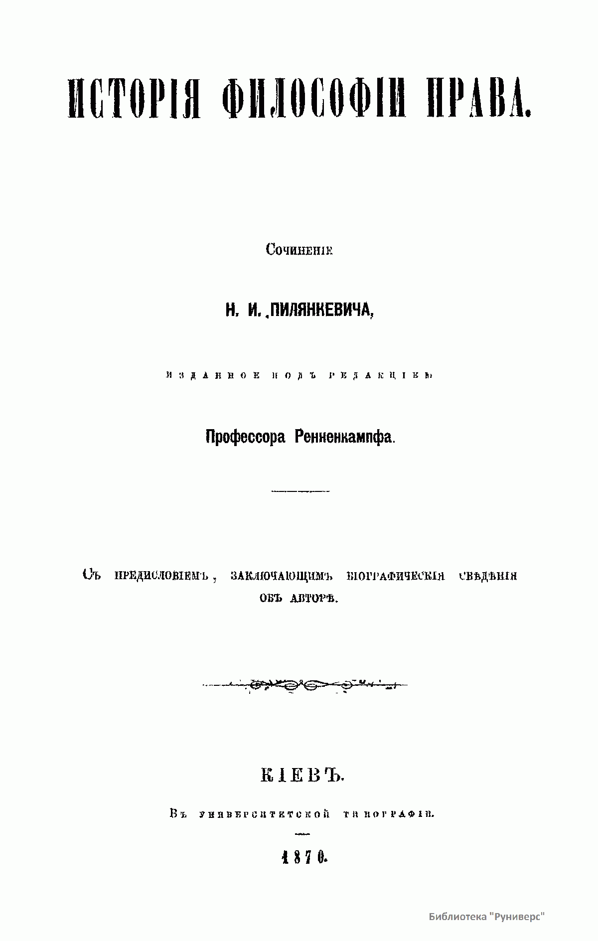 Издавая ныне труд Н.И. Пилянкевича, мы руководствовались многими соображениями: во-первых, мы думаем, что не смотря на значительное число лет, отделяющих его от настоящего времени, он может служить и теперь некоторым пособием и руководством для студентов-юристов, изучающих историю философии права, тем более что мы совершенно бедны сочинениями по этому предмету на русском языке; со времени истории философии права, представленной Неволиным в его Энциклопедии (1839 г.), приобретена нами всего одна книга: Очерк (весьма краткий) истории философии права Гейера (перевод с немецкого 1866 г.). Во- вторых, труд этот, совершенный в тяжелый период нашего высшего просвещения, может служить доказательством, что и тогда в наших университетах, при всем преобладании лишь формального исполнения своего долга, были лица, делавшие, по мере сил своих, настоящее дело. Наконец, изданием этого труда нам хотелось бы принести хотя позднюю поправку когда-то допущенной погрешности, и сколько-нибудь воздать добрую память Н.И. Пилянкевичу, который, без сомнения, заслуживал лучшей участи. Киев, 7 января 1870 г. Н. Ренненкампф