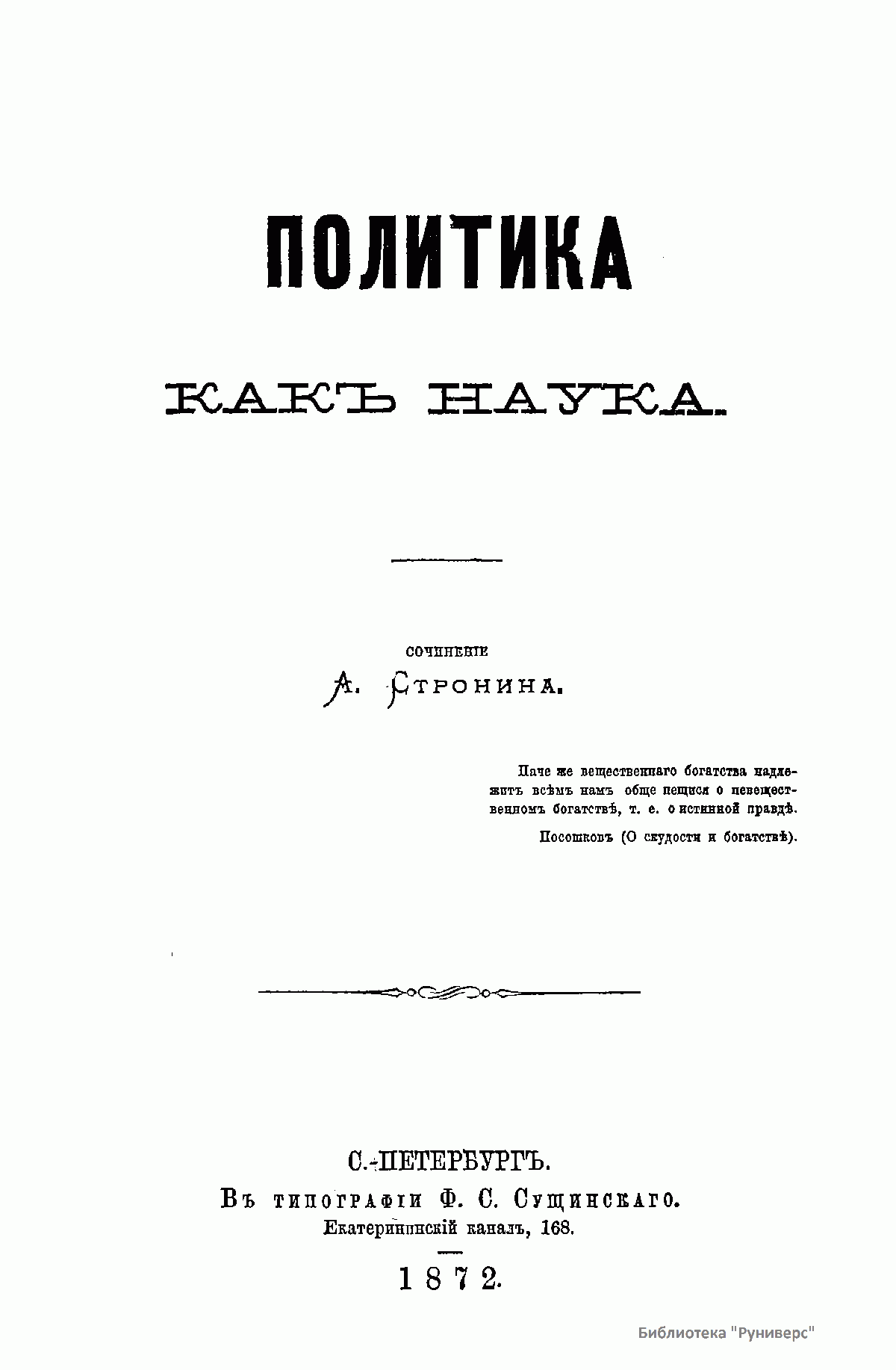 «Наука политики» для автора выступает в качестве компонента общей социологии и, анализируя в книге политические отношения в России, он использует идеи и принципы О.Конта и Г.Спенсера. Стронин выделяет три основных закона функционирования «социального тела»: общий биологический закон; общий социологический закон: общий политический закон. Социология политики для него подразделяется на прикладную и фундаментальную теорию, что определяет структуру данной работы: одна часть посвящена теоретическому обоснованию модели и общему структурированию политического процесса, а вторая «политической диагностике и прогностике России».