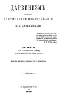 Публицист, социолог, идеолог панславизма в своем трехтомном труде "Дарвинизм. Критическое исследование" (1885 г.) Н.Я. Данилевский собрал воедино возражения, высказанные против дарвинизма за четверть века его существования, и изложил собственные взгляды на эволюцию органических форм.