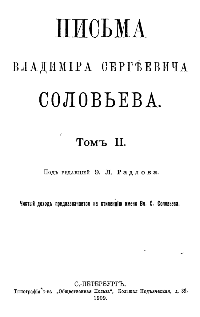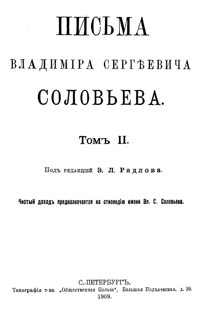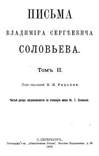Собрание писем выдающегося русского религиозного мыслителя и поэта подготовлено к печати историком философии Эрнестом Радловым, который совместно с Владимиром Соловьёвым редактировал философскую часть словаря Брокгауза и Ефрона.