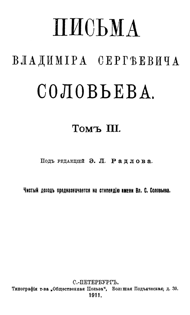Собрание писем выдающегося русского религиозного мыслителя и поэта подготовлено к печати историком философии Эрнестом Радловым, который совместно с Владимиром Соловьёвым редактировал философскую часть словаря Брокгауза и Ефрона.