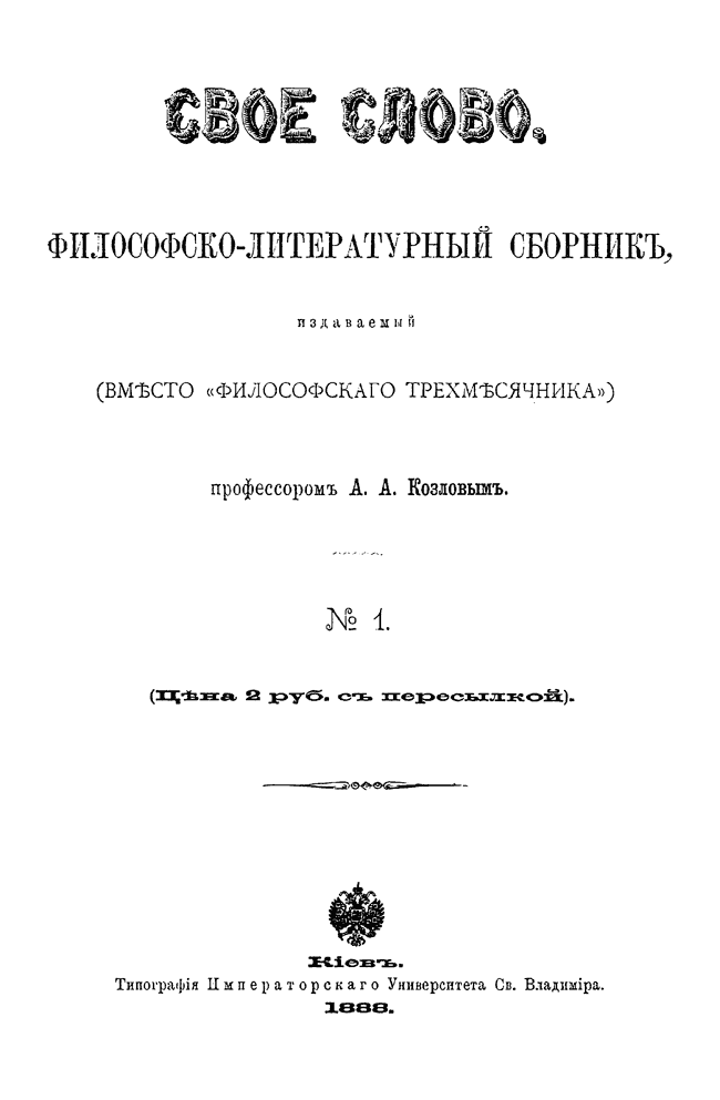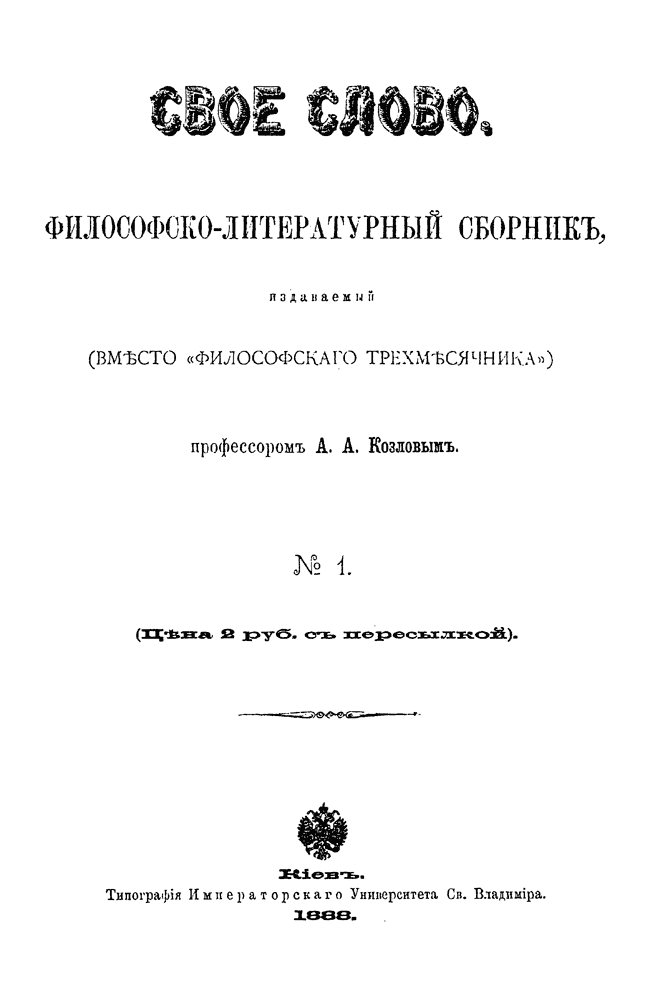 Сборник, который философ-спиритуалист А.А. Козлов - один из первых представителей персонализма в России, начал выпускать вместо выходившего ранее журнала «Философский трехмесячник». Как и предшествующее издание, « Свое слово» состоит исключительно из статей самого автора. В этих публикациях он в итоговой форме формулирует свои философские воззрения, в которых развивает концепцию панпсихизма.