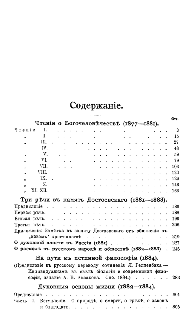 В первые два тома вошли его философские сочинения 1873-1880 гг., в третий – богословские 1877-1884 гг., в четвертом собраны работы, посвященные Церкви 1883-1887 гг., в пятом – публицистические произведения, включая «Национальный вопрос в России», том шестой объединяет критические сочинения, работы по эстетике и труды исторического характера, седьмой том посвящен нравственной философии, а в заключительных томах представлены сочинения последних лет жизни Соловьева.