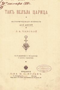 В небольшой исторической повести «Так велела царица» автор рассказывает об эпохе Екатерины I детям младшего возраста. Заслуга Чарской заключается в том, что она, прислушиваясь к исследованиям современной ей педагогики, разрабатывает исторические сюжеты для детей младшего возраста. В конце XIX — начале ХХ века для детей младшего возраста почти не печаталось подходящего исторического чтения, кроме того, которое знакомило юное поколение с военными подвигами наших предков.