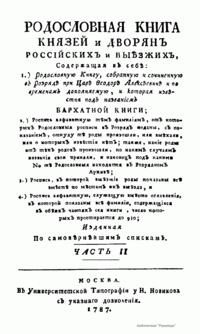 В 1787 г. «Бархатная книга» была издана Н. И. Новиковым под названием «Родословная книга князей и дворян российских и выезжих», она является ценным документом для генеалогических исследований. Названа она так, потому что имела бархатный переплет.«Бархатная книга» была составлена в 1687 г. в связи с отменой местничества в 1682 г., когда была прекращена практика составления разрядных книг. В Б. к. включены: "Государев родословец" 1555—56 гг., состоявший преимущественно из родословных записей потомков Рюриковичей и Гедиминовичей (царский, княжеские, боярские роды), а также материалы за 2-ю половину 16—17 вв. из родословных росписей, поданных представителями этих фамилий в 1682—87. Как исторический источник Б. к. изучена еще недостаточно, в ней имеются фактические ошибки и фальсификации.Лит.: Родословная книга князей и дворян российских и выезжих (Бархатная книга), М., 1787.