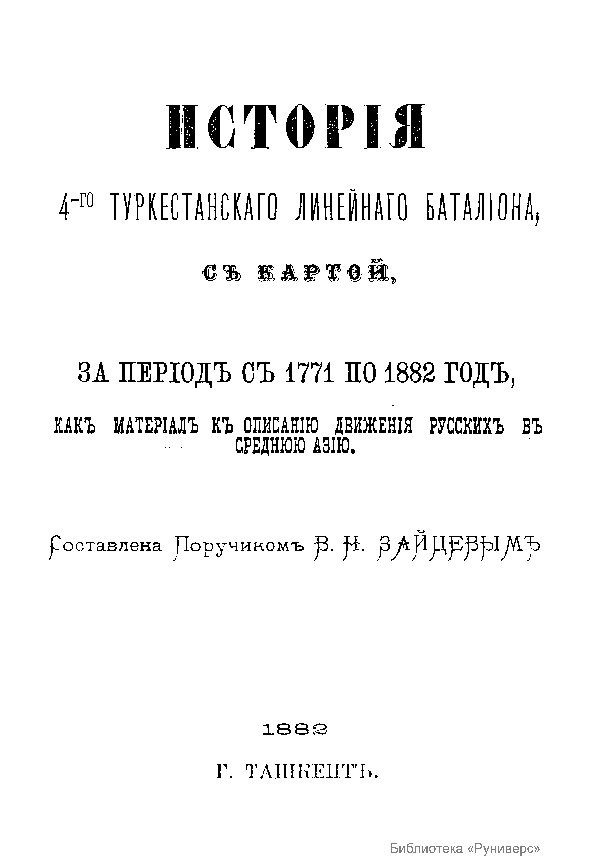 Исторiя 4-го Туркестанскаго линейнаго баталiона, с картой, за периодъ съ 1771 по 1882 годъ, какъ матерiалъ къ описанiю движенiя русскихъ въ Среднюю Азiю