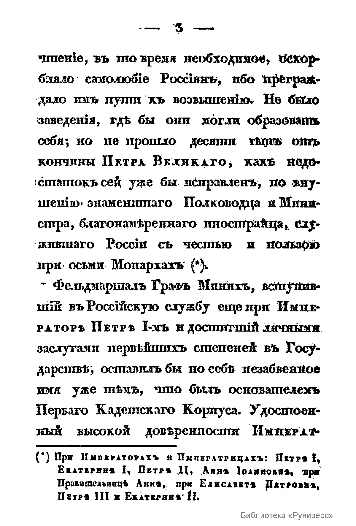 Очерк истории Первого кадетского корпуса, подготовленный в связи со 100-летием его создания, принадлежит перу одного из наиболее известных российских военных историков, выпускнику кадетского корпуса Александру Васильевичу Висковатову. Это издание удостоилось высокой оценки Николая I, что в дальнейшем повлияло на всё творчество военного историка. Кадетские корпуса своими корнями уходят в 1653 год. Именно тогда великий курфюрст Пруссии создал школу для несения детьми дворян воинской службы. Позже в 1715 году прусским королем Фридрихом Вильгельмом I была сформирована рота кадет, шефом которой был назначен будущий полководец четырехлетний Фридрих Великий. Сухопутный кадетский корпус в России был основан в царствование императрицы Анны Иоанновны по предложению одного из видных российских политиков и дипломатов, ближайшего соратника Петра Великого, бывшего генерал-прокурора Сената, графа П.И. Ягужинского, лично ознакомившегося с существовавшими в те годы кадетскими корпусами в Берлине и Копенгагене. Этот проект был поддержан военным министром генерал-фельдмаршалом графом Б.Х. Минихом, который составил план устройства «Корпуса кадет». 29 июля 1731 г. императрица подписала указ об учреждении в Санкт-Петербурге «Корпуса кадетов» и утвердила представленный Минихом план его устройства. Первым генерал-директором был также назначен сам фельдмаршал Миних. Особым указом было предложено дворянам присылать своих сыновей в корпус для получения здесь военного образования. Корпусу были отведены все постройки дворца на Васильевском острове, раннее принадлежавшего опальному князю А.Д. Меншикову, «с площадью земли ограниченной двумя с половиной верстами по периметру». Все имение было пожаловано корпусу в вечное владение. 17 февраля 1732 г. было положено начало занятиям в так называемой «Рыцарской Академии». В корпусе в то время было 56 кадет. В строевом и административном отношении корпус делился на гренадерскую, мушкетерскую и конную роты. Корпусу было пожаловано знамя с инициалами императрицы. В начале царствования Елизаветы Петровны, корпус получил наименование «Сухопутного Шляхетного Кадетского Корпуса», в отличие от учреждавшегося тогда, из бывшей еще при Петре Великом школы навигацких наук, Морского кадетского корпуса. В царствование Елизаветы Петровны, в стенах корпуса прошли обучение такие выдающиеся полководцы и государственные деятели как генерал-фельдмаршал Румянцев-Задунайский, генералиссимус Суворов-Рымникский князь Италийский, генерал-фельдмаршалы князь Прозоровский и граф Каменский, генерал Мелисино, будущий первый; русский драматург Сумароков, поэт Херасков, писатель Озеров и многие другие. При Екатерине Великой, в корпусе были произведены значительные реформы. В 1766 г. был введен новый устав, составленный И.И. Бецким. Корпус кадет, принятый императрицей под особое покровительство, стал именоваться «Императорским Шляхетским сухопутным кадетским корпусом». По новому уставу обучение и воспитание в корпусе должно было начинаться с 6-ти летнего возраста и продолжаться в течение 15 лет. Все кадеты делились на 5 возрастов, при чем первые три именовались младшим классом, затем средним и старшим классами, а 4-й и 5-й – военными возрастами, с пребыванием в каждом также по 3 года. Деление на роты было сохранено для военных возра