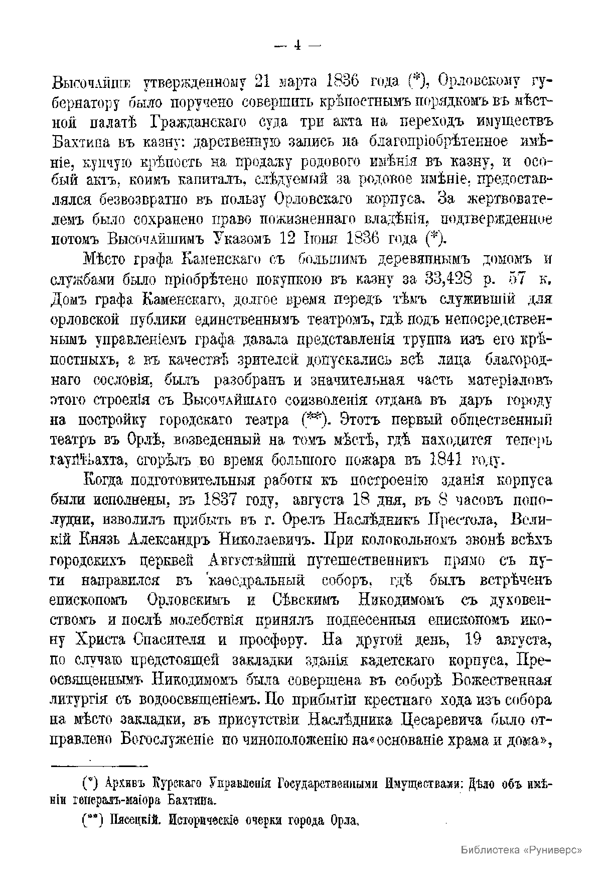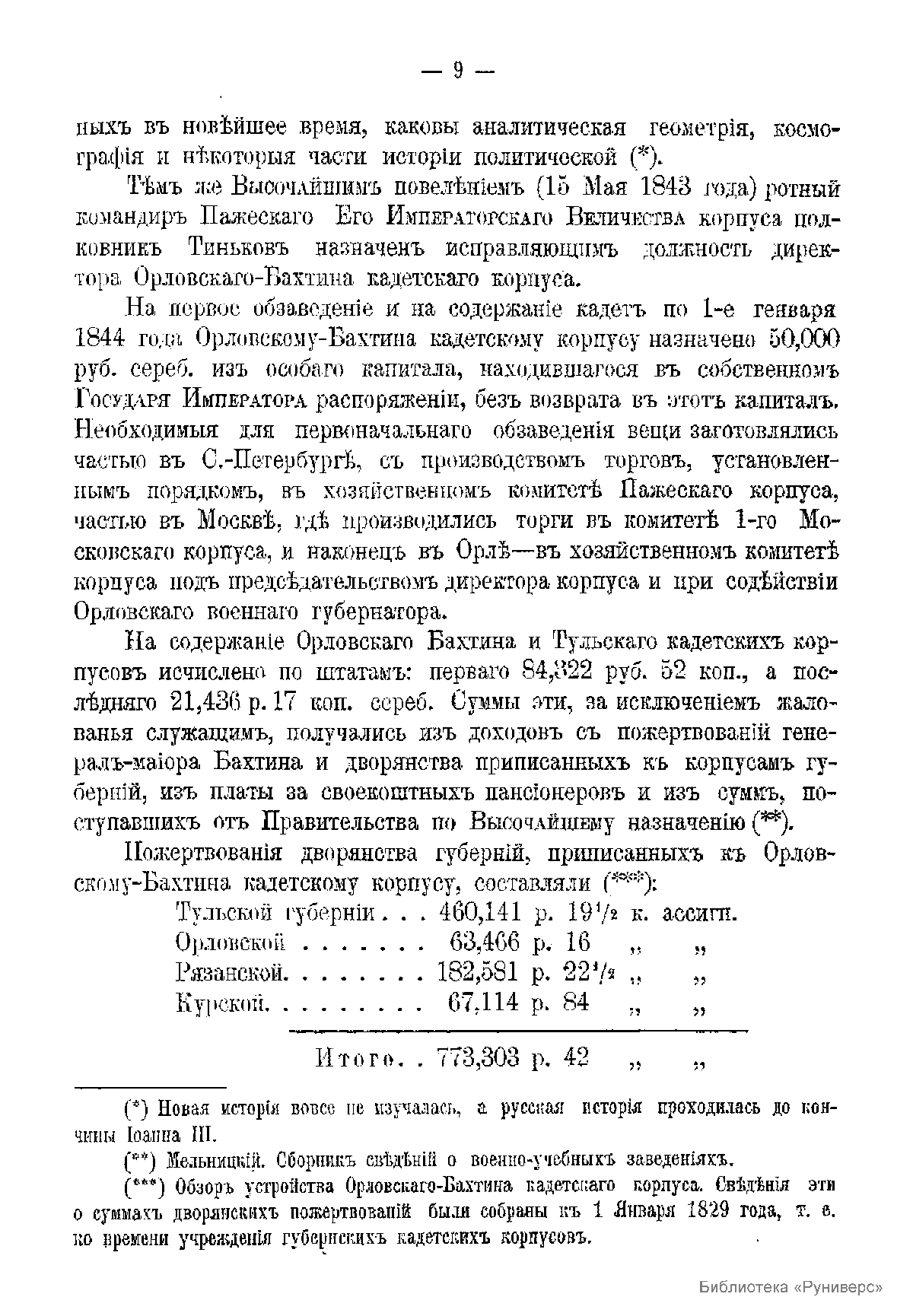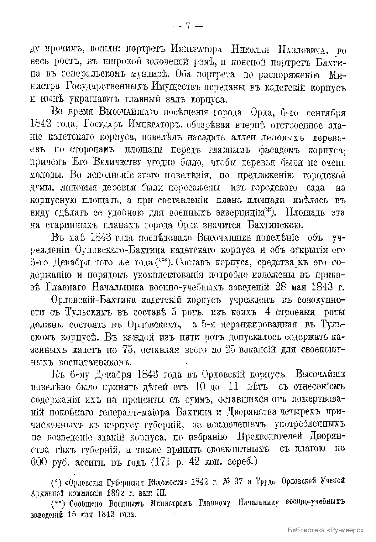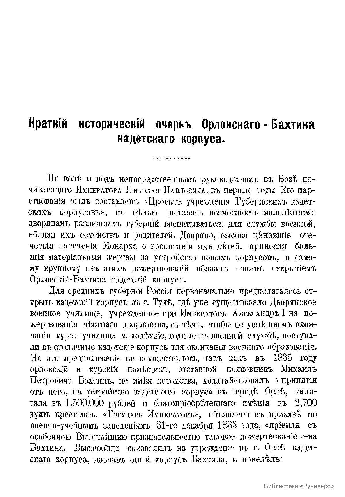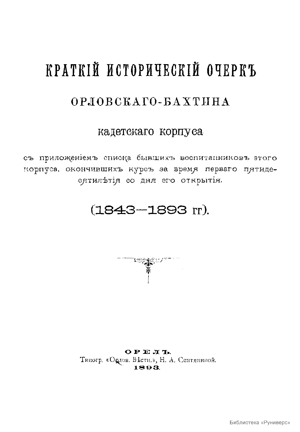 Краткий исторический очерк Орловского-Бахтина кадетского корпуса, с приложением списка бывших воспитанников этого корпуса, окончивших курс за время первого пятидесятилетия со дня его открытия. (1843-1893 гг.)