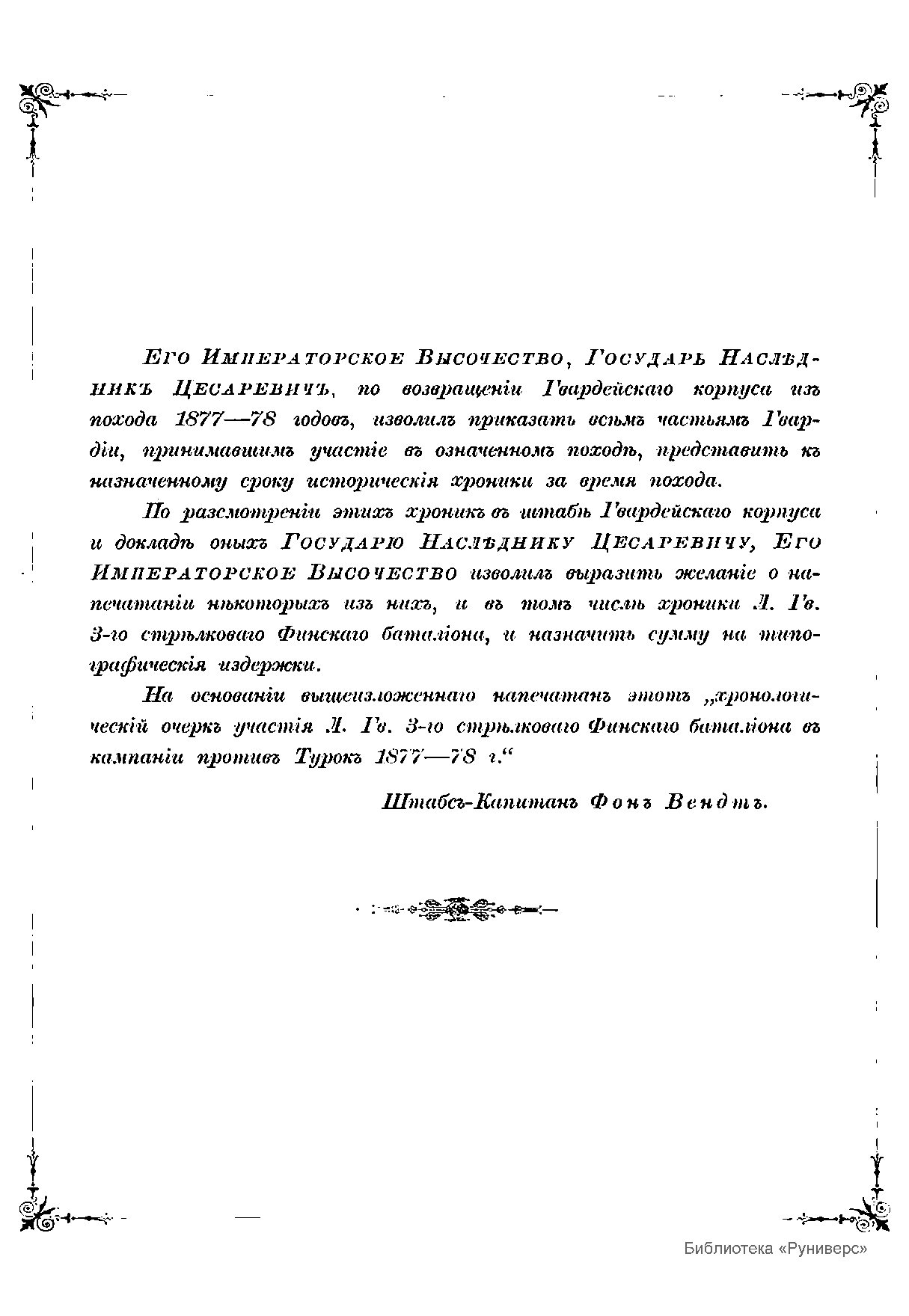 Книга Арона фон Вендта содержит описание участия Лейб-гвардии 3-го Стрелкового финского батальона на балканской театре Русско-турецкой войне 1877 - 1878 гг. В частности представлены сведения о составе батальона, описание боев под Горным Дубняком и под Филипполем и др. Также прилагаются цветные планы военных действий батальона. Лейб-гвардии 3-й Стрелковый финский батальон вел свою преемственность от сформированного в 1818 г. Гельсингфорсского учебного батальона. В 1826 г. он был назван Финским учебным стрелковым, а в 1829 г. причислен к молодой гвардии и назван Лейб-гвардии Финским стрелковым. В 1831 г., в составе войск гвардейского корпуса, Лейб-гвардии Финский стрелковый батальон принимал участие в русско-польской войне 1830 – 1831 гг. В 1849 г. батальон вместе с гвардией участвовал в Венгерском походе, а в 1854 - 1856 гг. находился в составе войск, охранявших берега Балтийского моря. Участвовал в русско-турецкой войне 1877 - 1878 г. С 20 августа 1871 г. батальон носил название 3-го Лейб-гвардии стрелкового Финского и входил в состав гвардейской стрелковой бригады. Лейб-гвардии 3-й стрелковый Финский батальон был расформирован 21 ноября 1905 г. по требованию финской общественности.