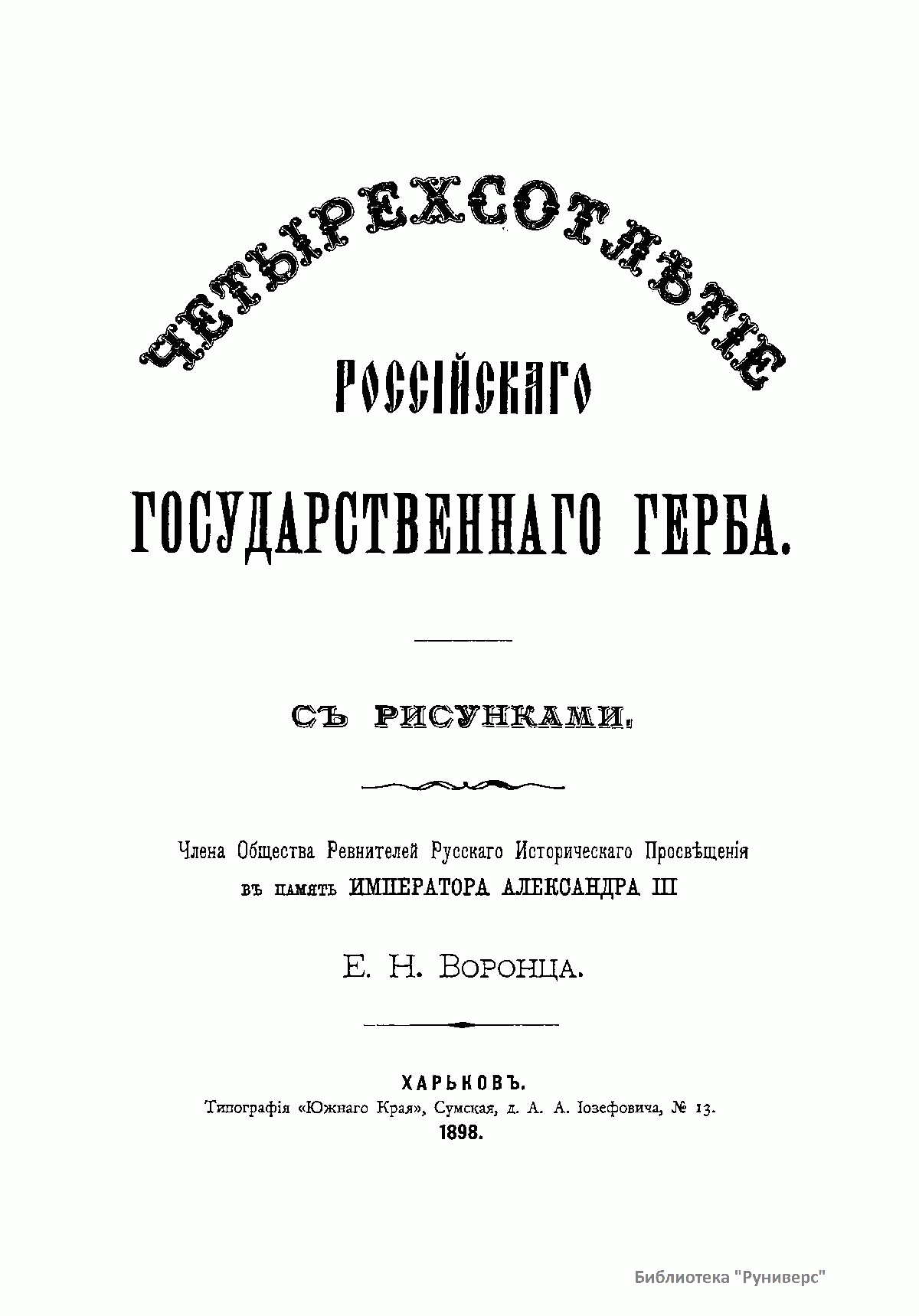 В июле 1897 года исполнилось 400 лет Российскому государственному гербу. Герб – это символ государства, выражающий его отличительную идею и основы. «Каждому русскому гражданину, сознательно относящемуся к основным историческим формам русского государственного строя, естественно почтить вниманием столь продолжительную долговечность отличительно русского символа». Автор настоящего издания считает гербоведение важной отраслью исторической науки и посвящает свой труд истории Российского герба, тесно связанной с историей печатей московских государей, восходящей до отдаленных времен договоров древних руссов с греками.