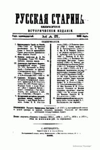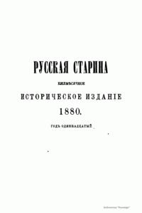 «Русская старина», ежемесячный исторический журнал, выходил в Петербурге в 1870-1918. Основан, издавался и редактировался (1870-1892) М. И. Семевским при участии В. И. Семевского. Последующими редакторами были Н. К. Шильдер (1892-1896), Н. Ф. Дубровин (1896-1904), военные историки С. П. Зыков, П. Н. Воронов.
