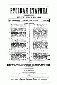 «Русская старина», ежемесячный исторический журнал, выходил в Петербурге в 1870-1918. Основан, издавался и редактировался (1870-1892) М. И. Семевским при участии В. И. Семевского. Последующими редакторами были Н. К. Шильдер (1892-1896), Н. Ф. Дубровин (1896-1904), военные историки С. П. Зыков, П. Н. Воронов.