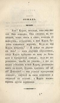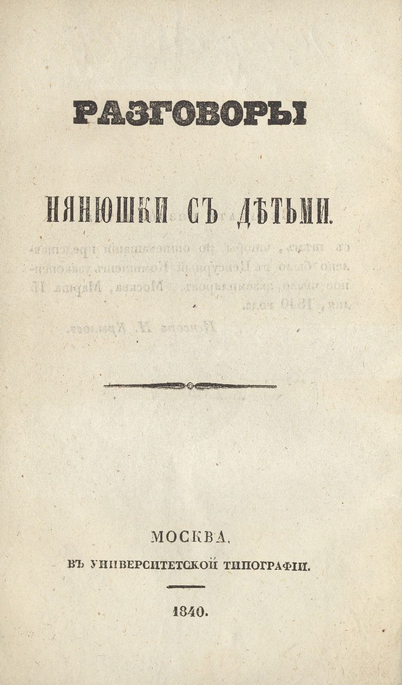 Издание «Разговоры нянюшки с детьми» – типичный пример познавательной литературы для детей второй половины XIX века. Такого рода книги охотно издавала Университетская типография. «Разговоры нянюшки...» – это десять небольших рассказов: «Корова», «Овца», «Петух», «Птица» и др., которые знакомят детей в основном с представителями животного мира, с их повадками и образом жизни. Все рассказы объединены героями – маленькими детьми: мальчиком Карлом и девочкой Луизой. Каждый рассказ сопровождает иллюстрация. Автор называет на обложке изображения «виньетками», но это – полноценные иллюстрации, призванные наиболее правдиво и точно изобразить предмет каждого рассказа няни.