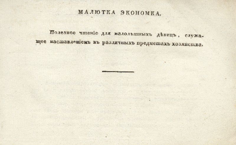 Издание «Малютка экономка...» служило юным читательницам «наставлением в различных предметах хозяйства». Подобного рода литература в ту эпоху чаще всего могла быть переводной; примеры такого познавательного и нравоучительного жанра брались в основном из немецкой литературы. Книга построена в виде описаний-рассказов к картинкам: ребенок приучался внимательно рассматривать сюжет, изображенный на иллюстрации, а затем уже ему читали текст или он сам вчитывался в него, как бы повторяя еще раз все то, что увидел на картинке. Рассказ обычно и начинается со слов «На сей картинке видите вы...».