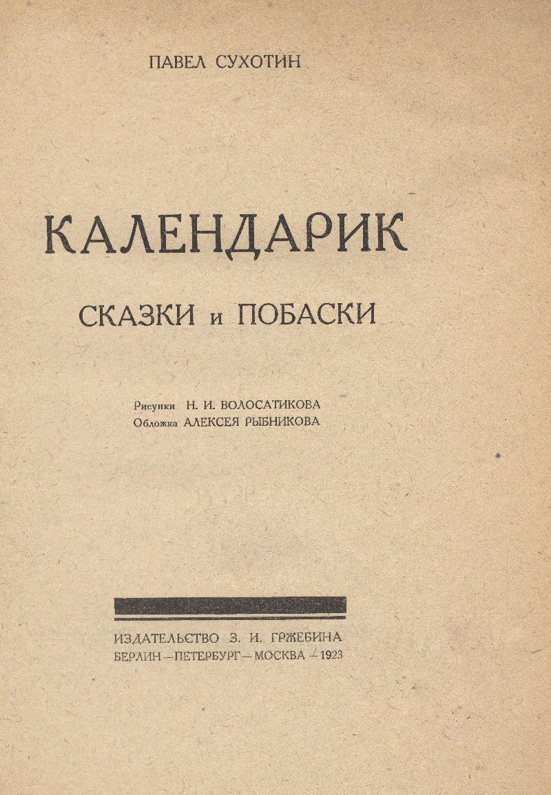 О детской книге Павла Сухотина «Календарик. Сказки и побаски» почти не упоминается и в без того кратких сведениях об этом авторе. О том, что Сухотин писал для детей, теперь знают лишь специалисты. На самом деле книга Сухотина привлекает внимание. Она была напечатана в 1923 году в издательстве З. И. Гржебина, который, как известно, основал свое частное предприятие в 1919 году с филиалами в Москве, а также Берлине, куда вскоре и уехал на постоянное жительство. Советский Союз заключил с З. И. Гржебиным договор о печатании им книг, но расторг его именно в год выхода книги Павла Сухотина: издательская политика Гржебина идеологически перестает устраивать страну рабочих и крестьян. Действительно, в стихах Сухотина вы не обнаружите ни столь привычных уже к этому времени и в детской литературе красных знамен, пионерских галстуков, призывов к лучшей жизни и прочей атрибутики новой страны. Сухотин верен основным темам своей лирики: он воспевает народные легенды и предания, использует темы усадебной жизни, образы русских народных сказок, описывает в своем «календарике» традиционные сезонные крестьянские работы, а не пролетарские праздники.
