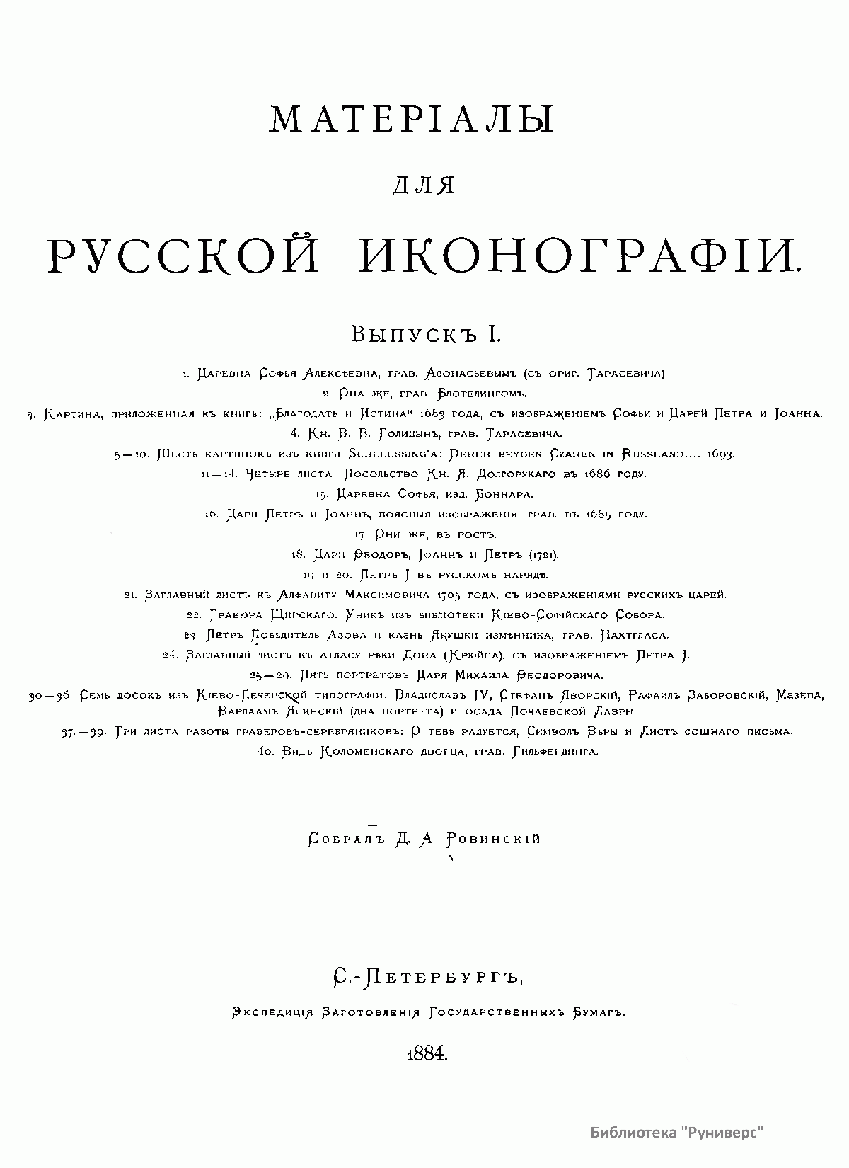 В 1882 г. Д. Ровинский издал книгу «Достоверные портреты московских государей: Ивана III, Василия Ивановича и Ивана IV Грозного – и посольства их времени». Это исследование составляло первый отдел предпринятой автором русской иконографии. За ним должны были следовать другие отделы. Материалов для каждого из этих отделов накопилось довольно много, но тем не менее существовали еще значительные пробелы, которые не позволяли приступить к систематическому изданию. Но так как любители и собиратели старины настаивали на издании, автор приступил к предварительной публикации собранных им снимков под общим названием «Материалы для русской иконографии». В эти материалы вошли портреты, виды, исторические и бытовые листы, листы, изготовленные для истории русской гравюры, работы граверов-серебряников, а также отпечатки с оригинальных старинных медных досок. Все снимки, за немногим исключением, сделаны в одну меру с оригиналами. Самые замечательные и редкие исполнены на меди по способу Г. Скамони, или печатаны со стекла посредством альбертотипии (у Шера и Набгольца в Москве и за границей) и фотогиалотипии (у г. Скамони); менее редкие и важные картинки исполнены посредством фотолитографии.