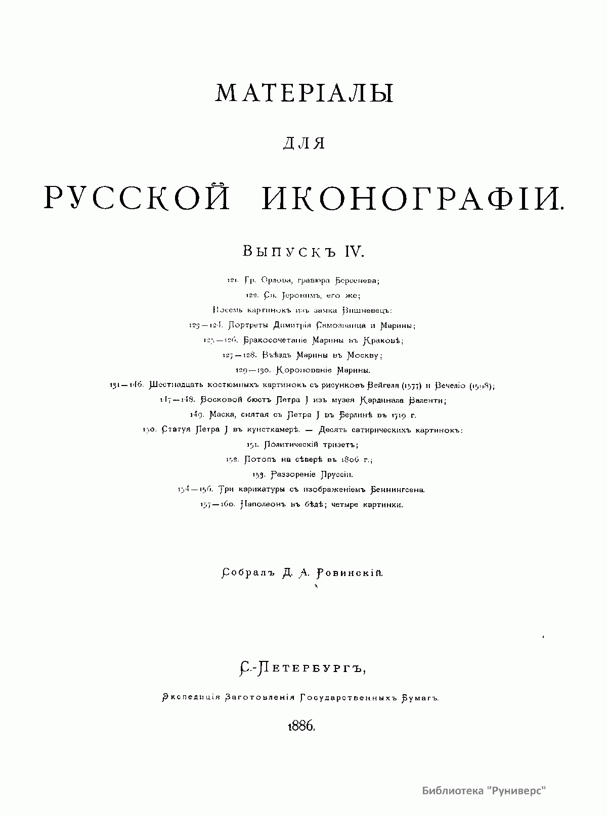 В 1882 г. Д. Ровинский издал книгу «Достоверные портреты московских государей: Ивана III, Василия Ивановича и Ивана IV Грозного – и посольства их времени». Это исследование составляло первый отдел предпринятой автором русской иконографии. За ним должны были следовать другие отделы. Материалов для каждого из этих отделов накопилось довольно много, но тем не менее существовали еще значительные пробелы, которые не позволяли приступить к систематическому изданию. Но так как любители и собиратели старины настаивали на издании, автор приступил к предварительной публикации собранных им снимков под общим названием «Материалы для русской иконографии». В эти материалы вошли портреты, виды, исторические и бытовые листы, листы, изготовленные для истории русской гравюры, работы граверов-серебряников, а также отпечатки с оригинальных старинных медных досок. Все снимки, за немногим исключением, сделаны в одну меру с оригиналами. Самые замечательные и редкие исполнены на меди по способу Г. Скамони, или печатаны со стекла посредством альбертотипии (у Шера и Набгольца в Москве и за границей) и фотогиалотипии (у г. Скамони); менее редкие и важные картинки исполнены посредством фотолитографии.