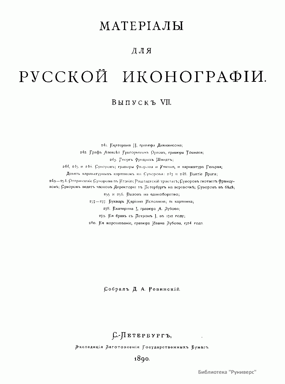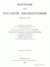 В 1882 г. Д. Ровинский издал книгу «Достоверные портреты московских государей: Ивана III, Василия Ивановича и Ивана IV Грозного – и посольства их времени». Это исследование составляло первый отдел предпринятой автором русской иконографии. За ним должны были следовать другие отделы. Материалов для каждого из этих отделов накопилось довольно много, но тем не менее существовали еще значительные пробелы, которые не позволяли приступить к систематическому изданию. Но так как любители и собиратели старины настаивали на издании, автор приступил к предварительной публикации собранных им снимков под общим названием «Материалы для русской иконографии». В эти материалы вошли портреты, виды, исторические и бытовые листы, листы, изготовленные для истории русской гравюры, работы граверов-серебряников, а также отпечатки с оригинальных старинных медных досок. Все снимки, за немногим исключением, сделаны в одну меру с оригиналами. Самые замечательные и редкие исполнены на меди по способу Г. Скамони, или печатаны со стекла посредством альбертотипии (у Шера и Набгольца в Москве и за границей) и фотогиалотипии (у г. Скамони); менее редкие и важные картинки исполнены посредством фотолитографии.
