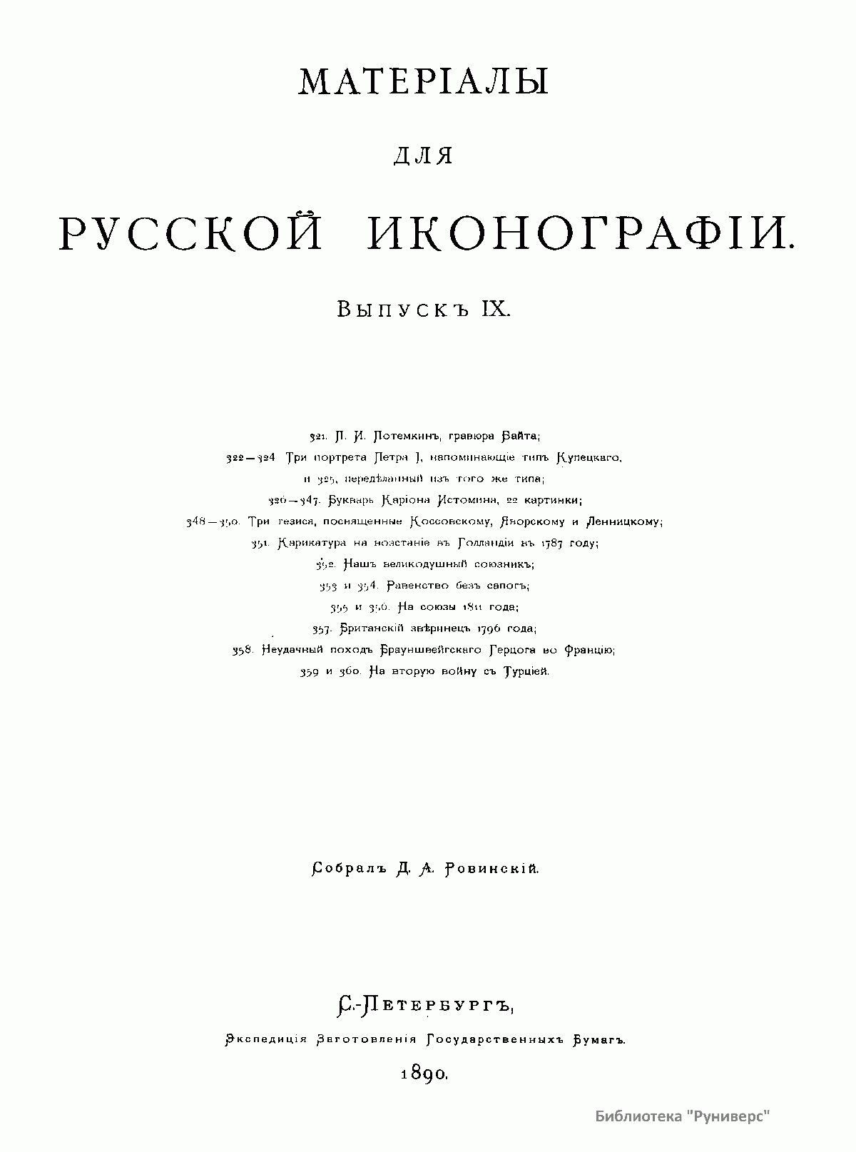 В 1882 г. Д. Ровинский издал книгу «Достоверные портреты московских государей: Ивана III, Василия Ивановича и Ивана IV Грозного – и посольства их времени». Это исследование составляло первый отдел предпринятой автором русской иконографии. За ним должны были следовать другие отделы. Материалов для каждого из этих отделов накопилось довольно много, но тем не менее существовали еще значительные пробелы, которые не позволяли приступить к систематическому изданию. Но так как любители и собиратели старины настаивали на издании, автор приступил к предварительной публикации собранных им снимков под общим названием «Материалы для русской иконографии». В эти материалы вошли портреты, виды, исторические и бытовые листы, листы, изготовленные для истории русской гравюры, работы граверов-серебряников, а также отпечатки с оригинальных старинных медных досок. Все снимки, за немногим исключением, сделаны в одну меру с оригиналами. Самые замечательные и редкие исполнены на меди по способу Г. Скамони, или печатаны со стекла посредством альбертотипии (у Шера и Набгольца в Москве и за границей) и фотогиалотипии (у г. Скамони); менее редкие и важные картинки исполнены посредством фотолитографии.